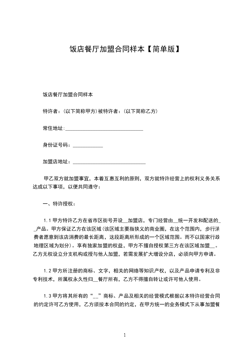 1.2乙方无权设立分支机构或授与他人加盟,若需发展扩大增设分店,必须向甲方申请。