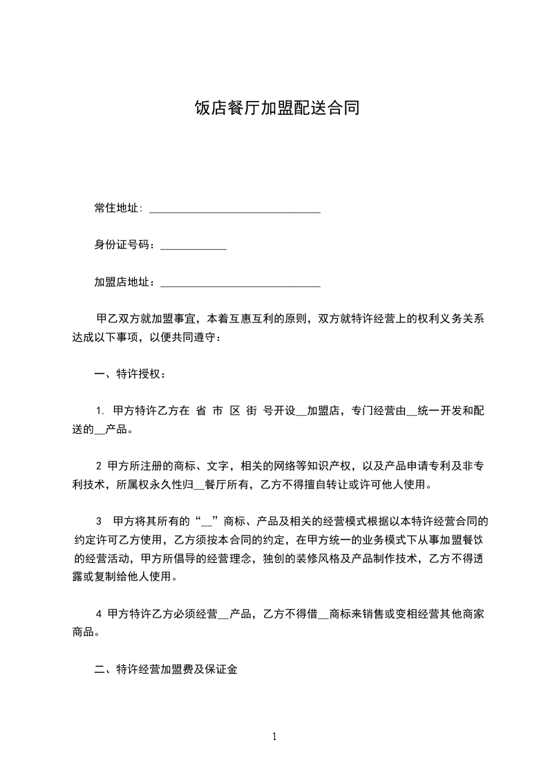 一、特许授权: . 甲方特许乙方在 省 市 区 街 号开设__加盟店,专门经营由__统一开发和配送的__产品。