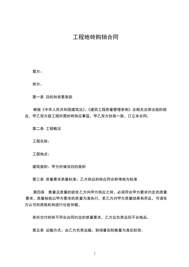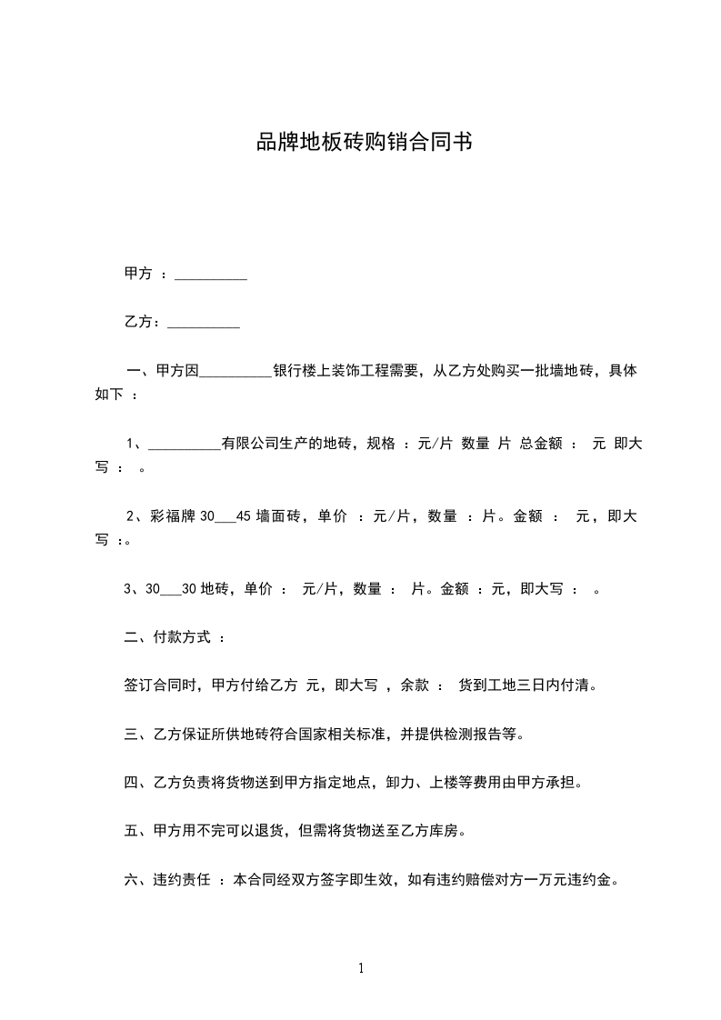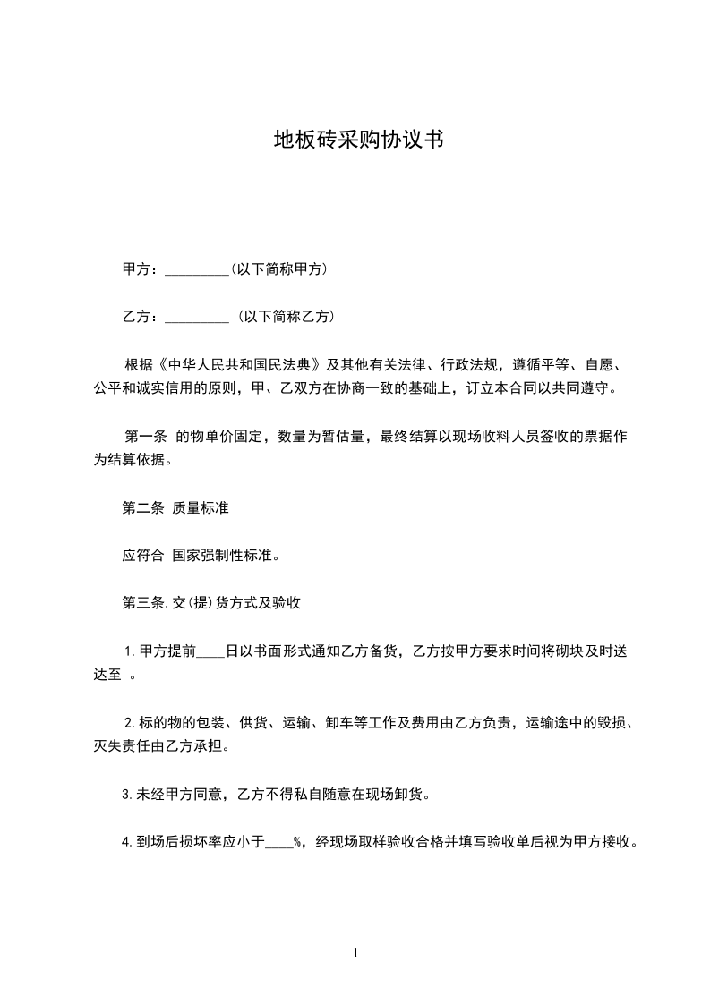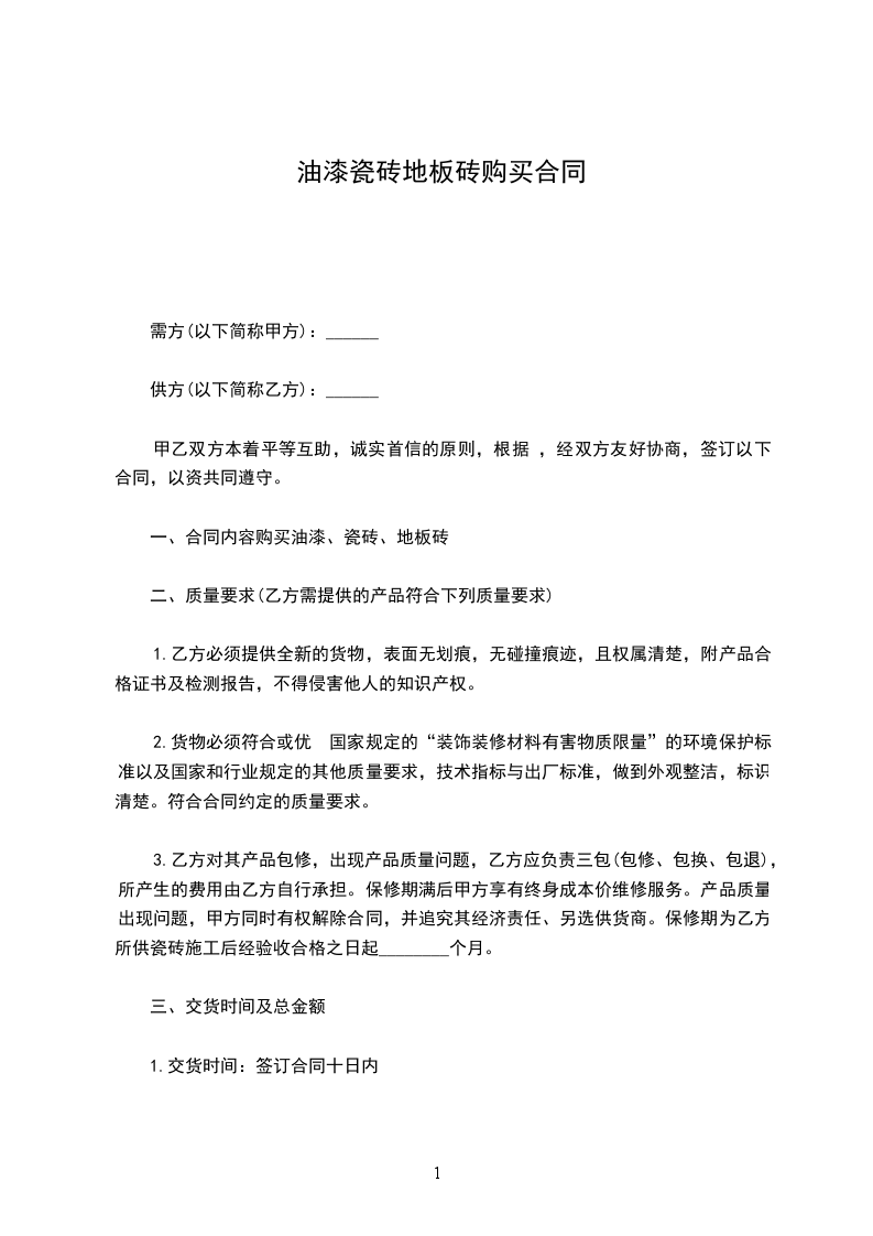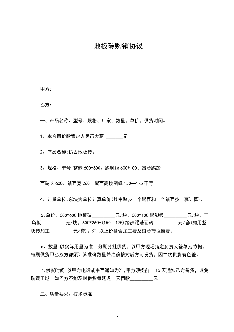 乙方需确保供货的质量,对有色差、尺寸偏差、翘折、破损、超标等缺陷的砖无条件退换。