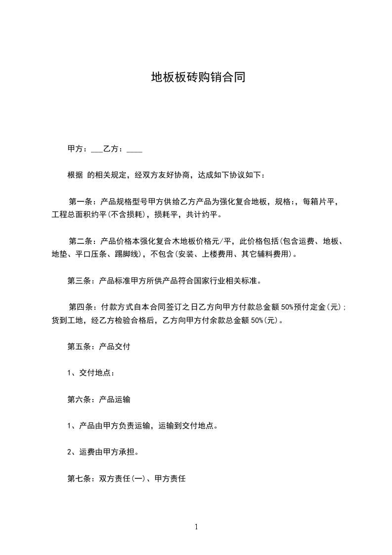 7、供货时间:以甲方电话或书面通知为准,甲方须提前15天通知乙方备货,以免耽误工期。如乙方不能及时供货每延迟—天罚款__________元。