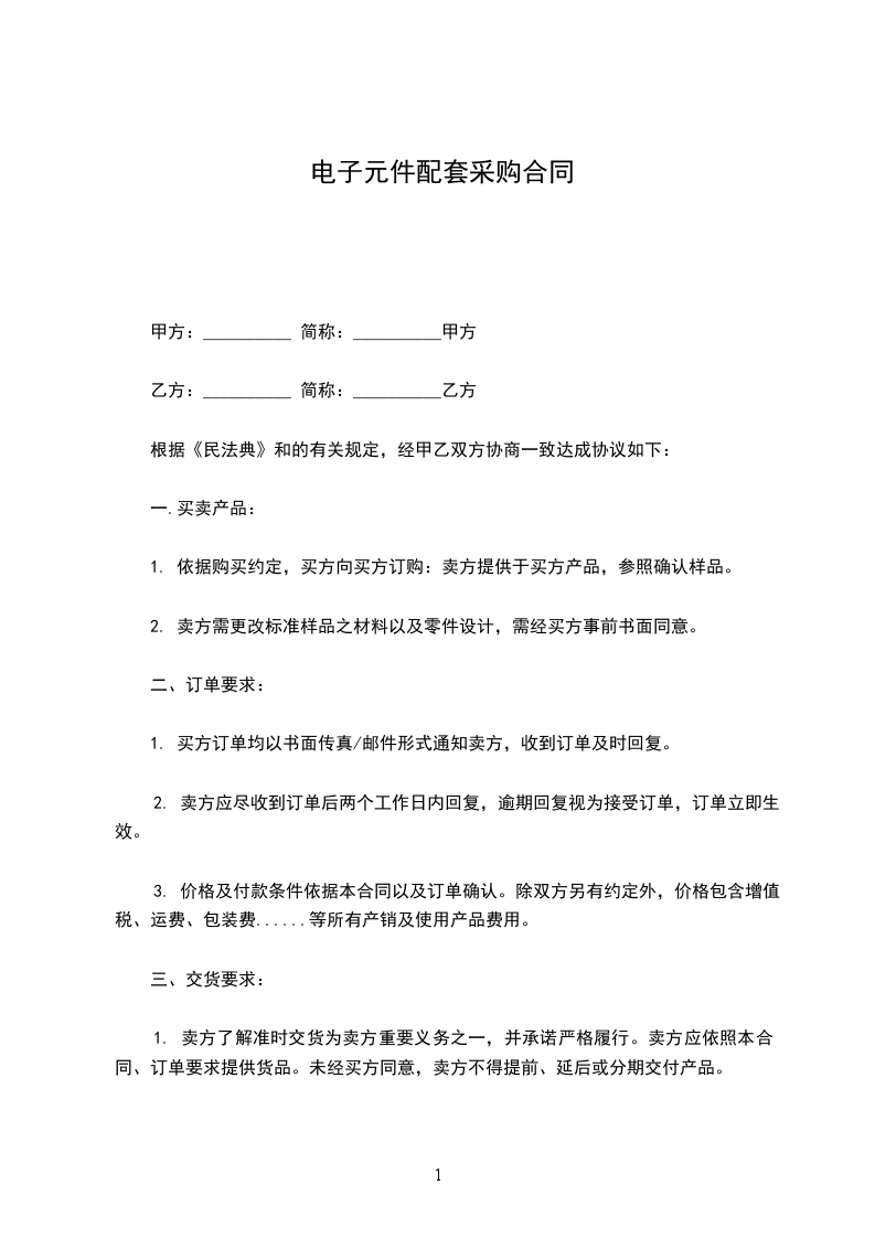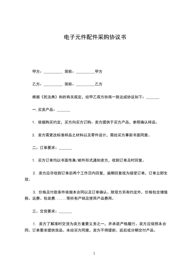 二、产品质量必须满足内燃机和汽车行业国际技术标准,如有特殊要求和技术协议须同时满足, 供方对质量负责的期限一年,如产品不合格,供方需承担所有的损失,并承担__年____月____日 _________年____月____日电子配件采购合同范文3订立合同双方:购货单位:____________供货单位:___________