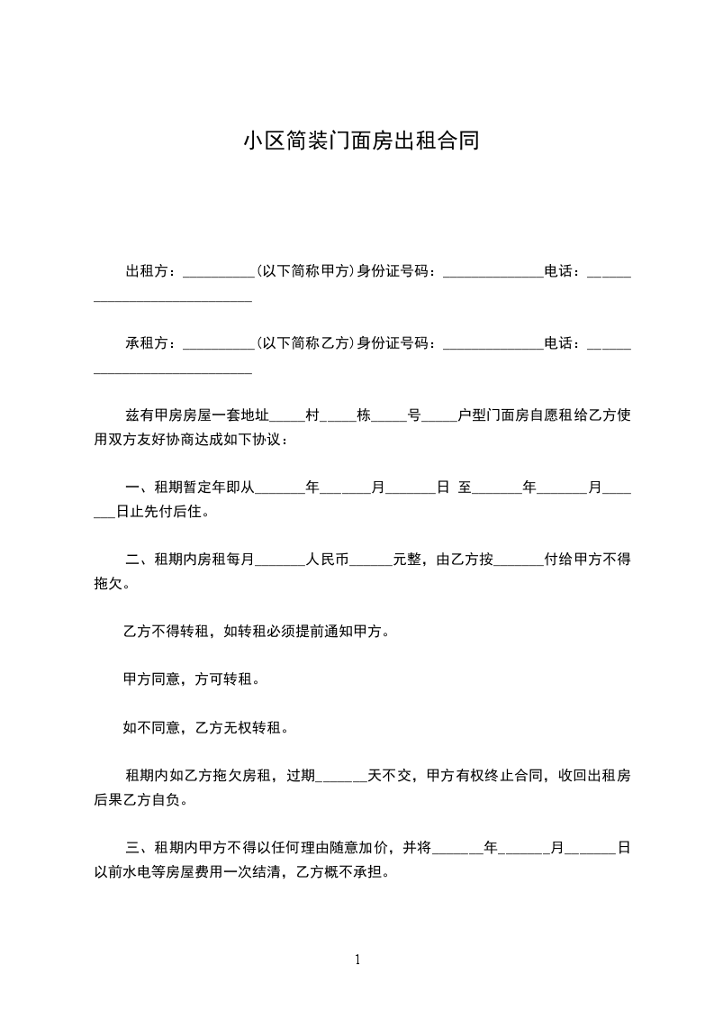 兹有甲房房屋一套地址_____村_____栋_____号_____户型门面房自愿租给乙方使用双方友好协商达成如下协议: