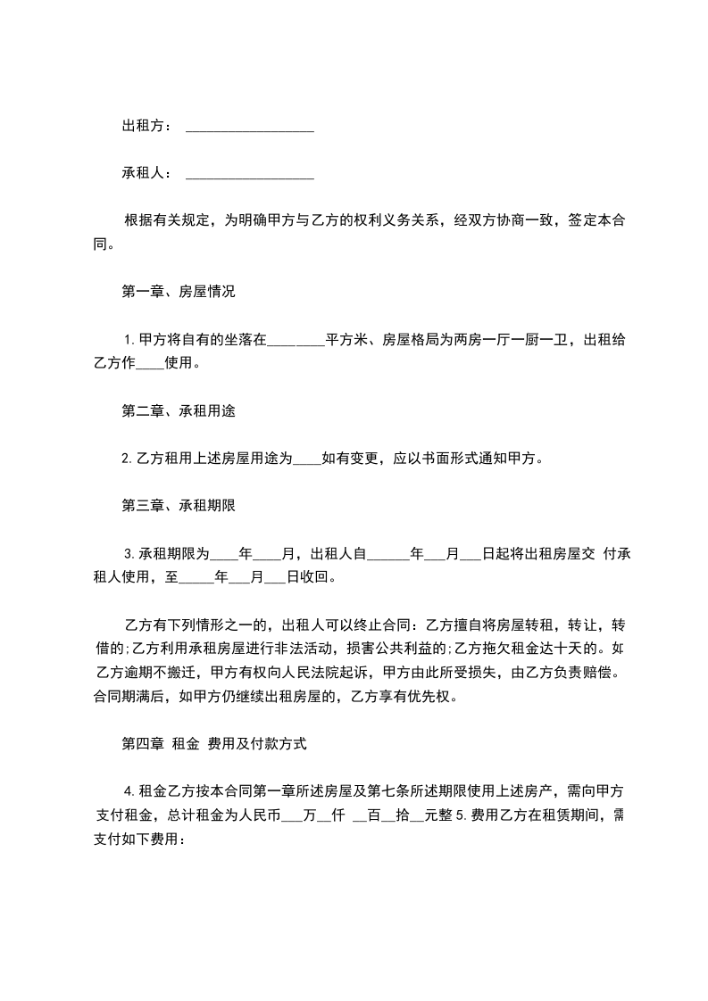 4.租金乙方按本合同第一章所述房屋及第七条所述期限使用上述房产,需向甲方支付租金,总计租金为人民币___万__仟 __百__拾__元整5.费用乙方在租赁期间,需支付如下费用: