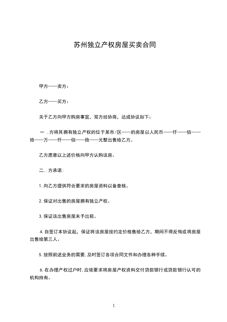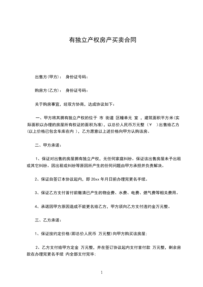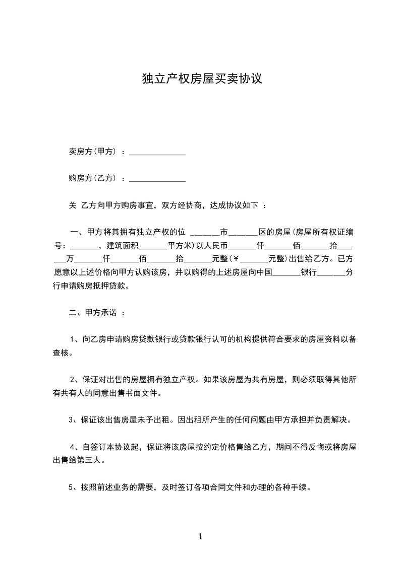 一 .方将其拥有独立产权的位于某市/区——的房屋以人民币——仟——佰——拾——万——仟——佰——拾——元整出售给乙方。