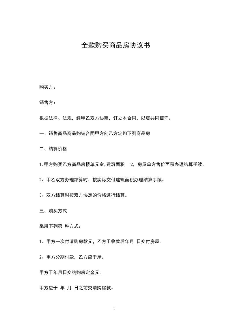 1、甲方一次付清购房款元,乙方于收款后年月 日交付房屋。