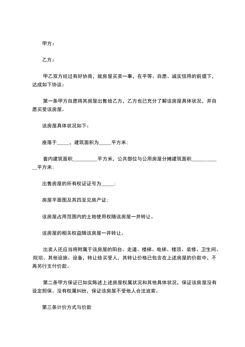第一条甲方自愿将其房屋出售给乙方,乙方也已充分了解该房屋具体状况,并自愿买受该房屋。