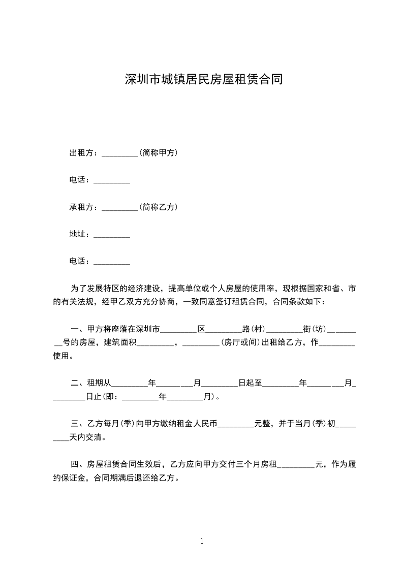 一、甲方将座落在深圳市_________区_________路(村)_________街(坊)_________号的房屋,建筑面积_________,_________(房厅或间)出租给乙方,作_________使用。