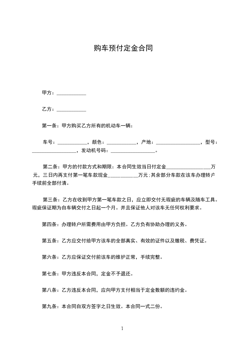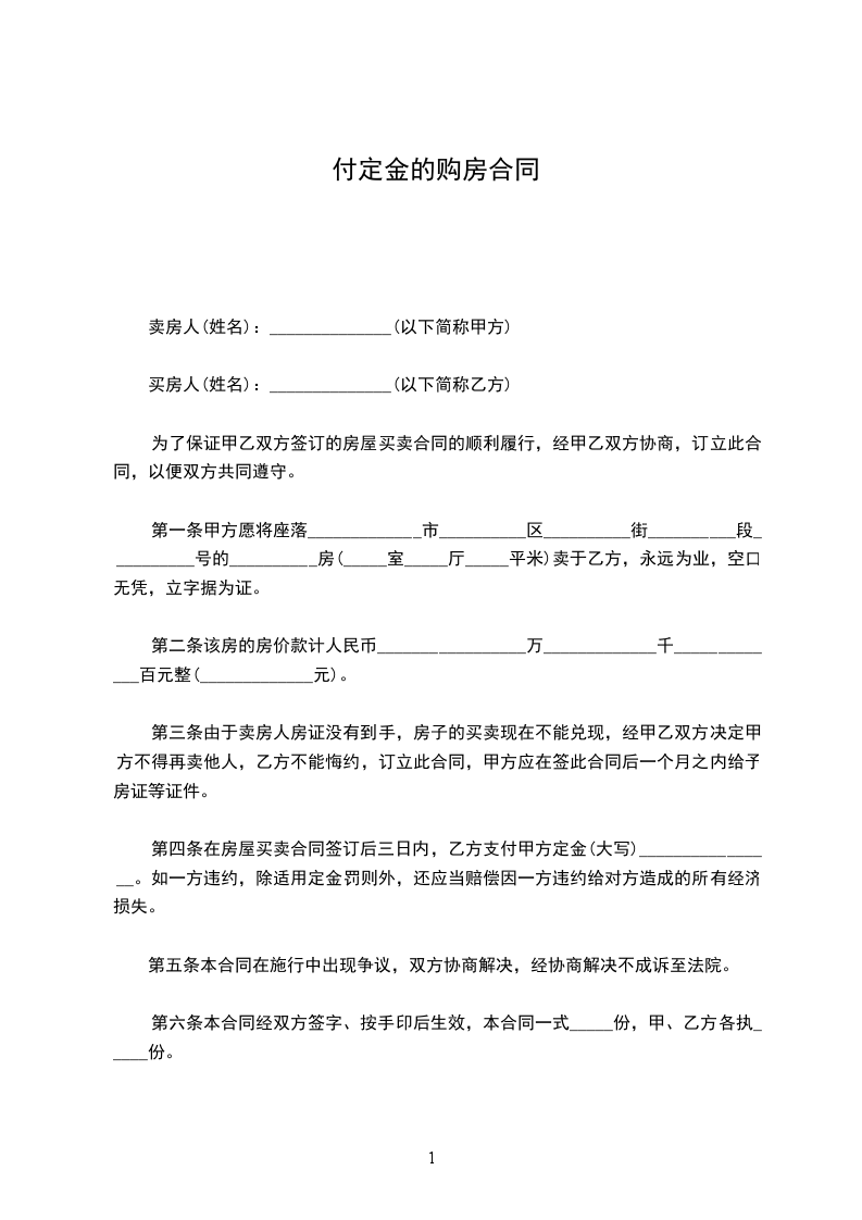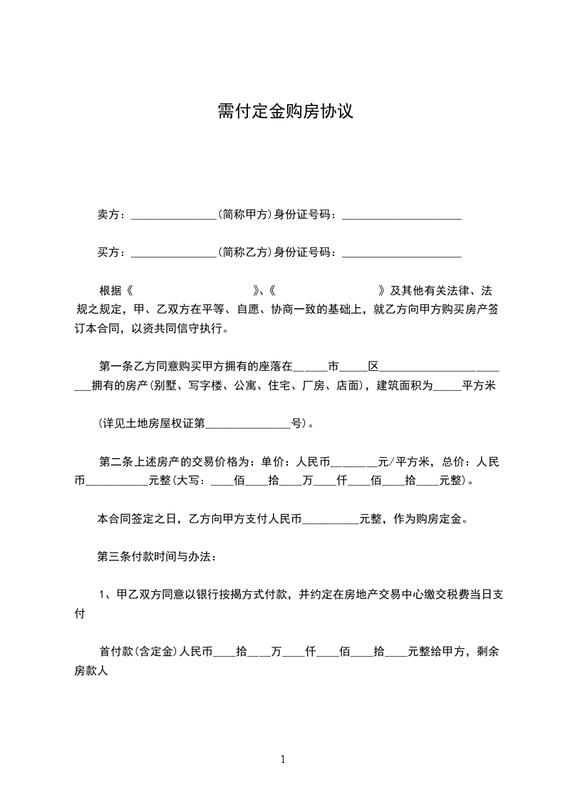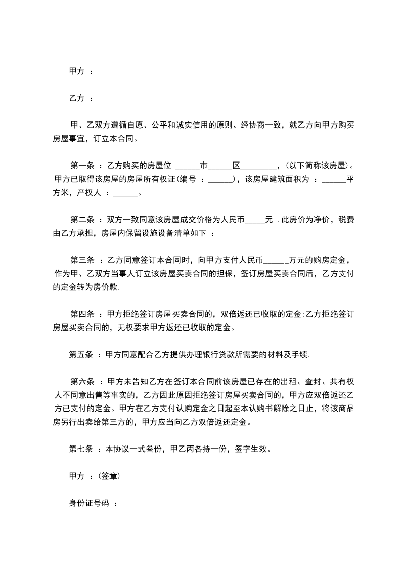 2. 甲方收到乙方定金______________________元整,待乙方申请的贷款批准后,即可为乙方准备办理过户手续。甲方需积极配合乙方办理贷款手续。(以收据收条为准)