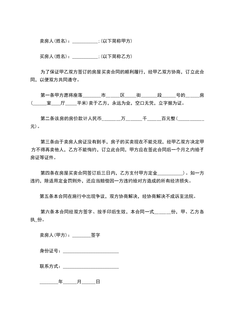 1. 双方议定上述房产出售价格为________________________元整。此房价款为甲方净价,甲方不支付交易中的任何费用。