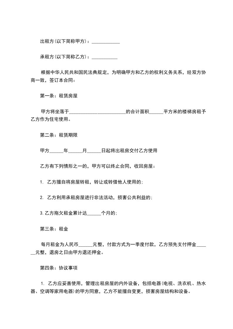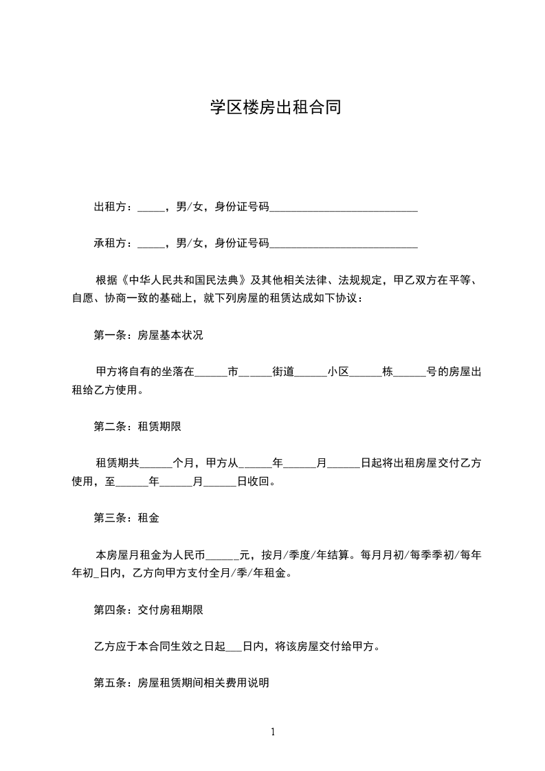 一、甲方将位于市街道小区号楼号的房屋出租给乙方居住使用,租赁期限自_____年_____月_____日至_____年_____月_____日,计_____个月。