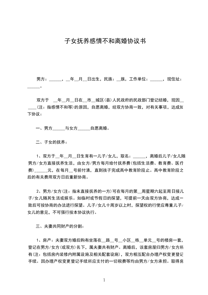 双方于 __年__月__日在__市__城区(县)人民政府的民政部门登记结婚,现因______(注:指感情不和等)的原因,自愿离婚,经双方协商一致,对有关事项,达成如下协议: