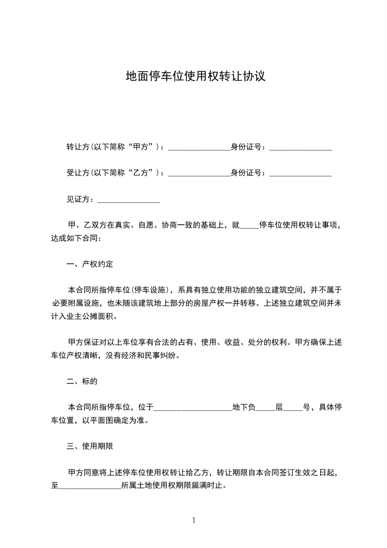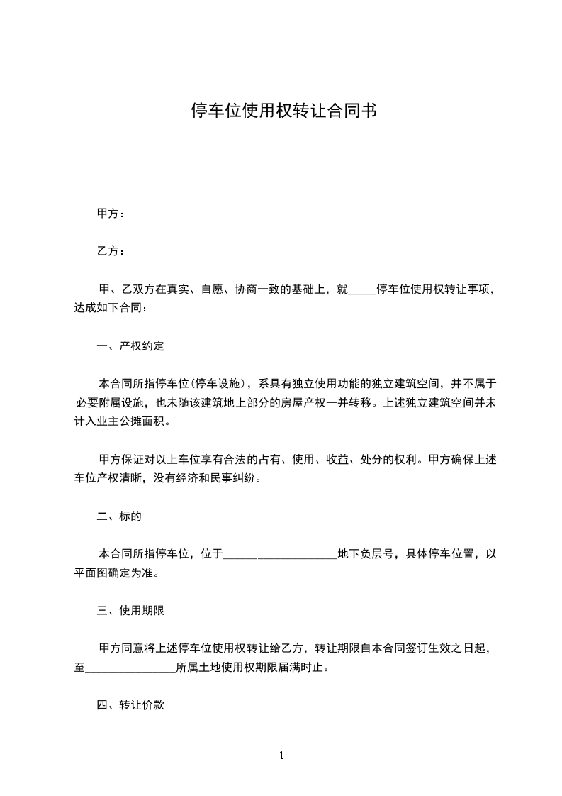 甲、乙双方在真实、自愿、协商一致的基础上,就_____停车位使用权转让事项,达成如下合同: