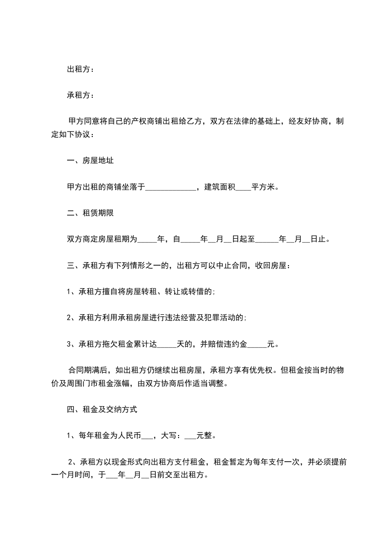 甲方同意将自己的产权商铺出租给乙方,双方依《中华人民共和国民法典》的相关规定,以自愿为原则经友好协商,制定如下协议,以便双方当事人遵守: