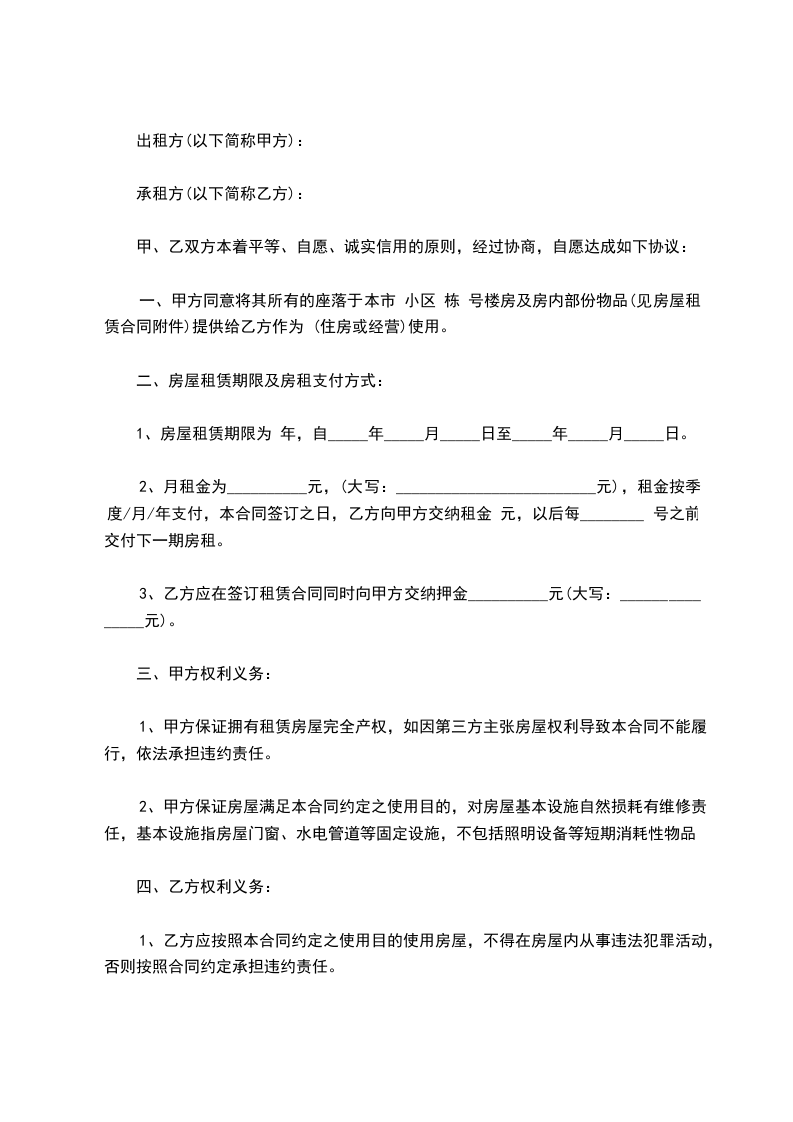 一、甲方同意将其所有的座落于本市 小区 栋 号楼房及房内部份物品(见房屋租赁合同附件)提供给乙方作为 (住房或经营)使用。