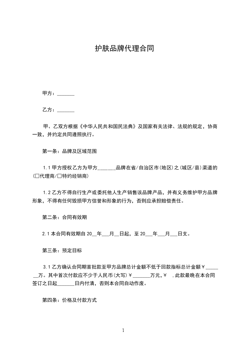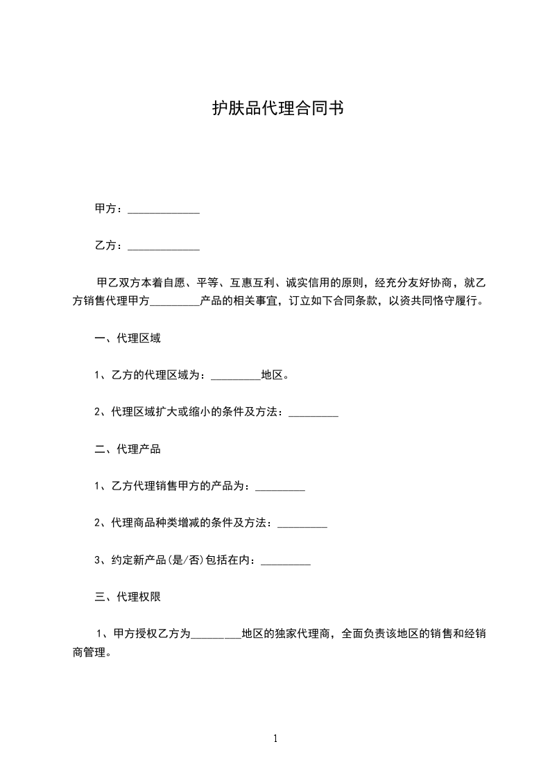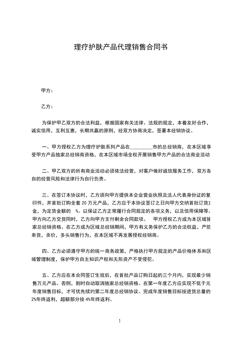 一、甲方授权乙方为理疗护肤系列产品在_________市的总经销商,在本区域享受甲方产品独家总经销商资格,在本区域市场全权开展销售甲方产品的合法商业活动。