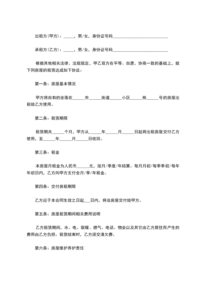 承租方(乙方):_____,男/女,身份证号码___________________________