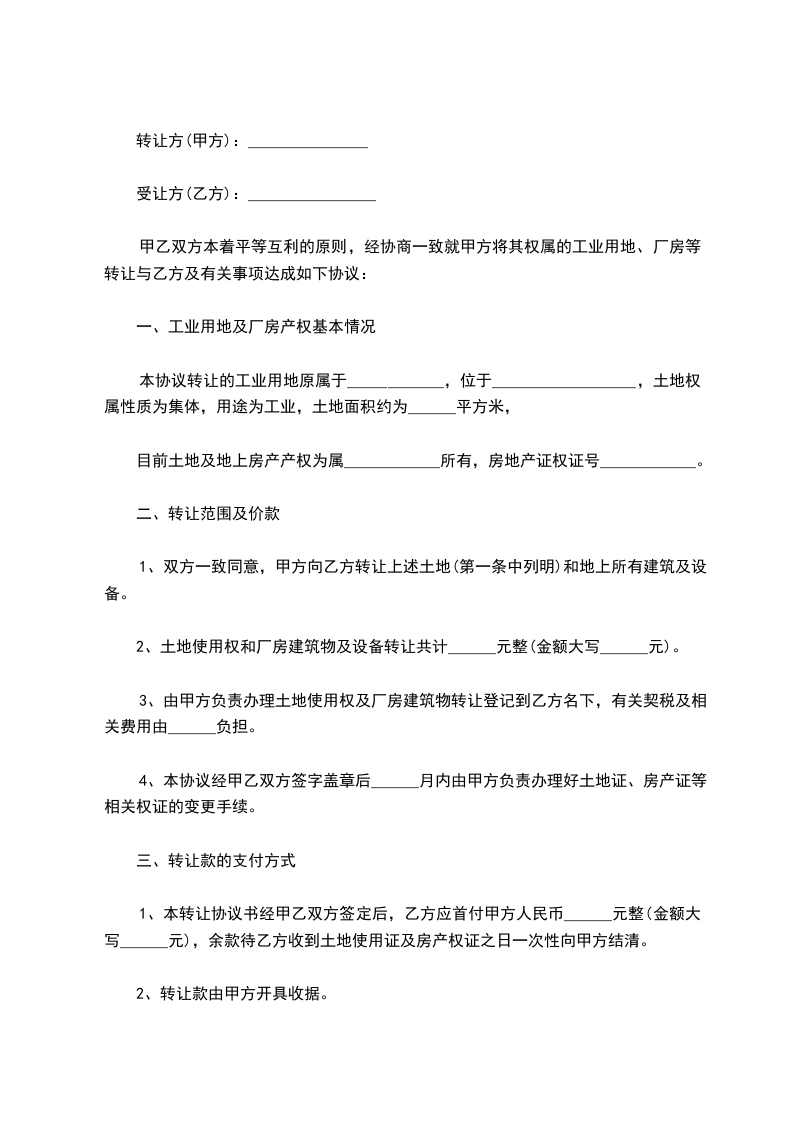 甲乙双方本着平等互利的原则,经协商一致就甲方将其权属的工业用地、厂房等转让与乙方及有关事项达成如下协议: