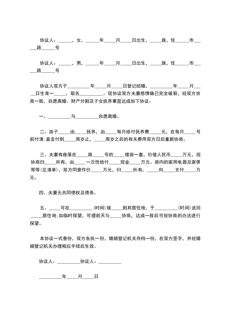 协议人双方于__________年_____月_____日登记结婚,__________年_____月_____日生育一_____,取名__________。现协议双方夫妻感情确已完全破裂,经双方协商一致,自愿离婚、财产分割及子女抚养事宜达成如下协议: