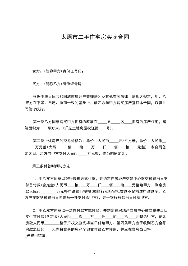2、甲乙双方同意以一次性付款方式付款,并约定在房地产交易中心缴交税费当日支付首付款(含定金)人民币____拾____万____仟____佰____拾____元整给甲方,剩余房款人民币________整于产权交割完毕当日付给甲方。第四条甲方应于收到乙方全额房款之日起____天内将交易的房产全部交付给乙方使用,并应在交房当日将_________等费用结清。