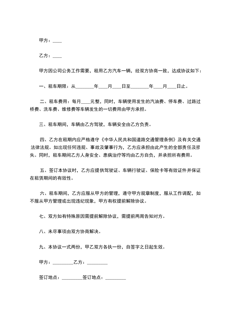 甲方因公司公务工作需要,租用乙方汽车一辆,经双方协商一致,达成协议如下:
