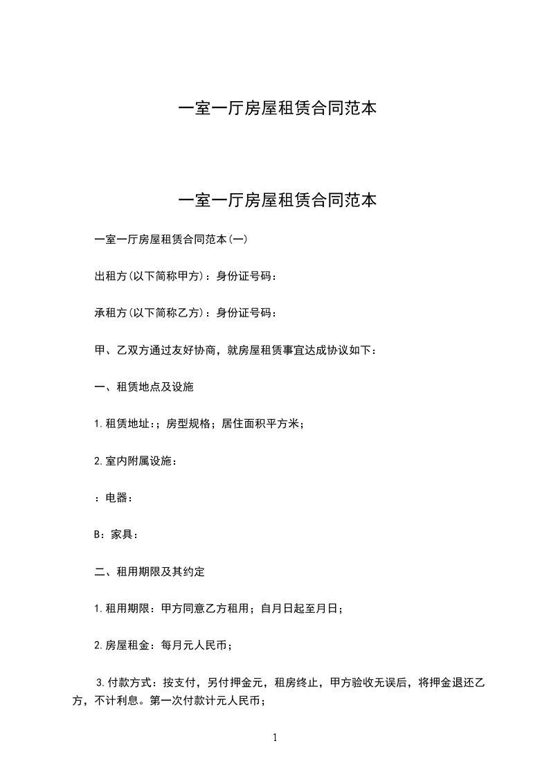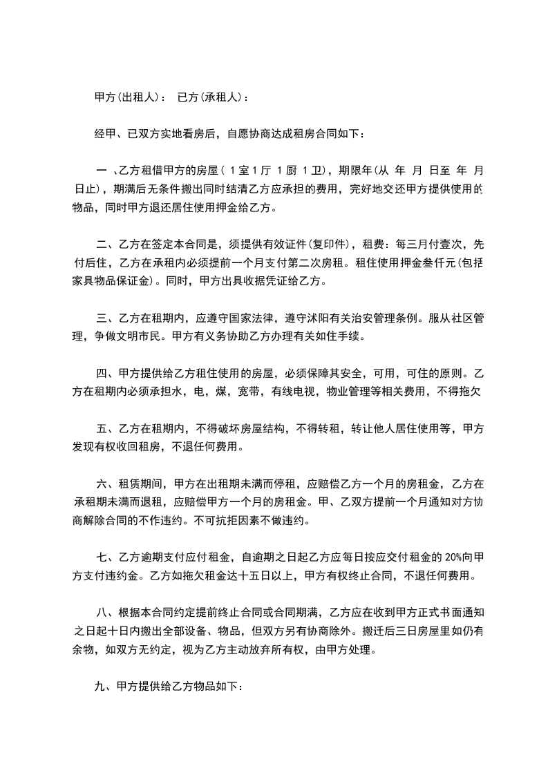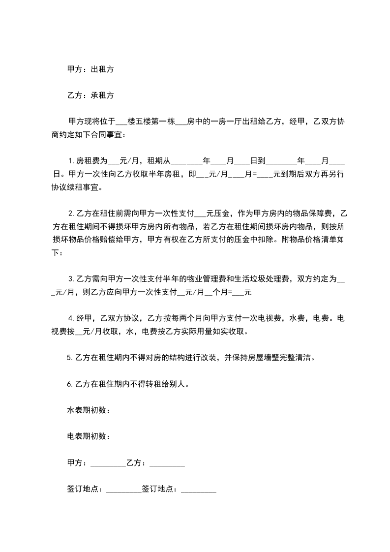 甲方现将位于___楼五楼第一栋___房中的一房一厅出租给乙方,经甲,乙双方协商约定如下合同事宜: