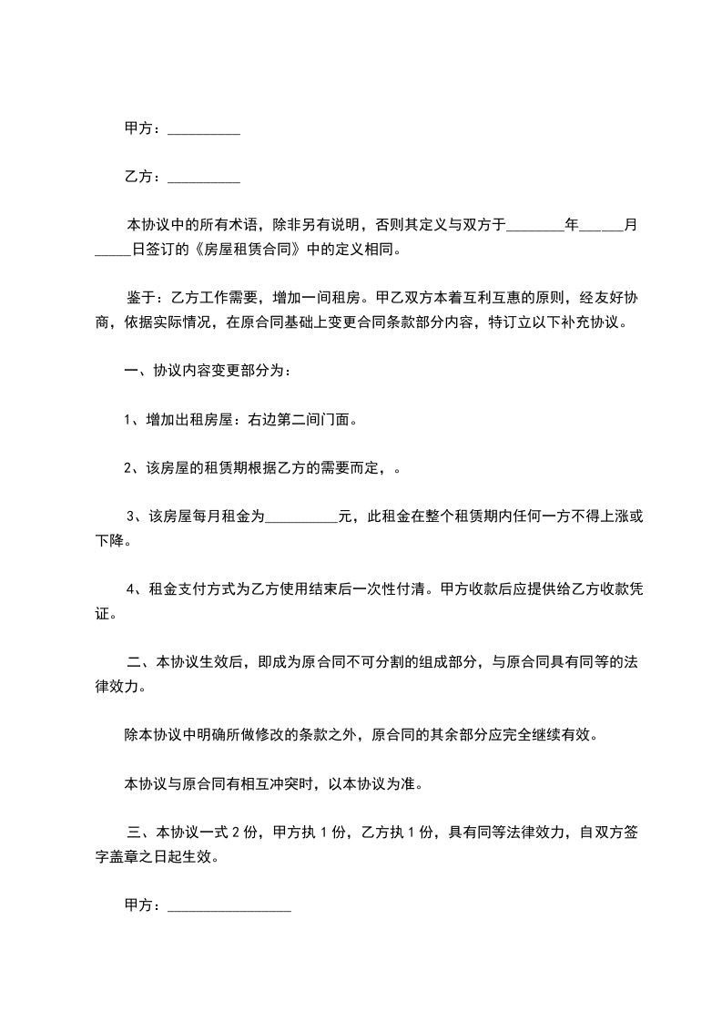 鉴于:乙方工作需要,增加一间租房。甲乙双方本着互利互惠的原则,经友好协商,依据实际情况,在原合同基础上变更合同条款部分内容,特订立以下补充协议。
