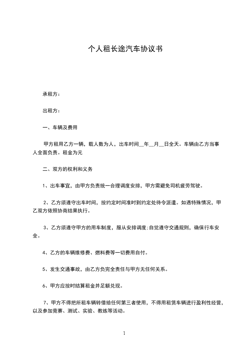 甲方租用乙方一辆,载人数为人,出车时间__年__月__日全天。车辆由乙方当事人全面负责。租金为_____元