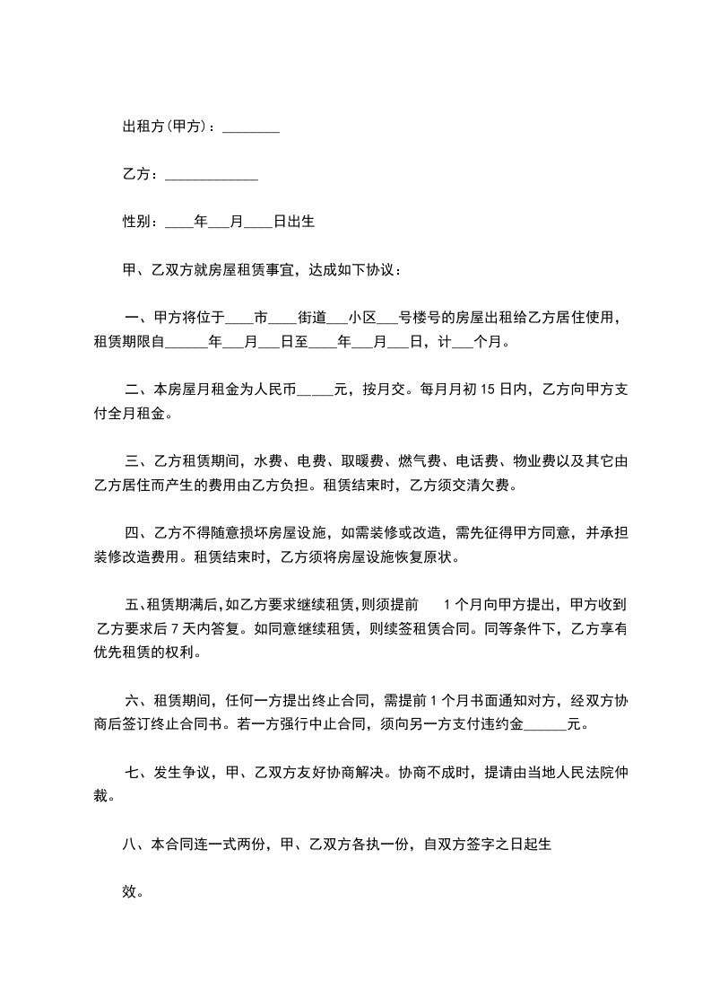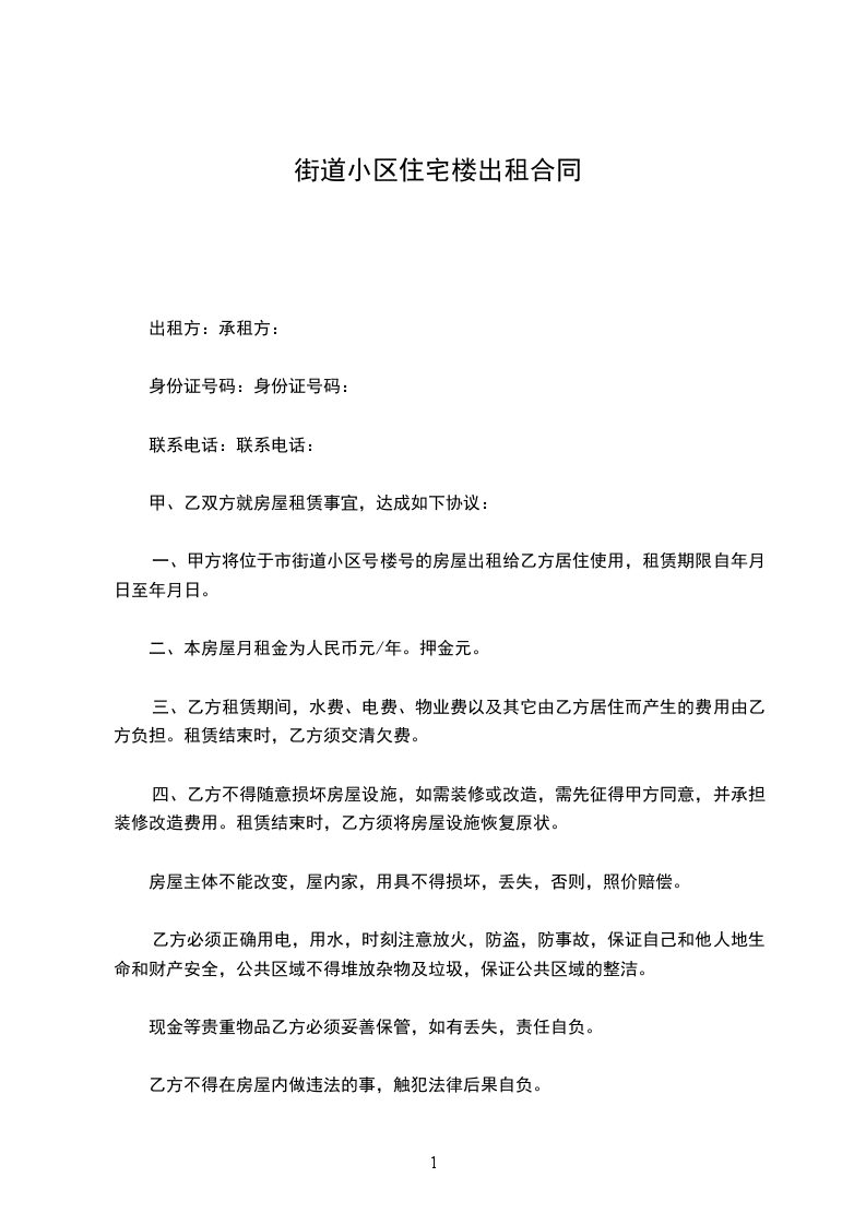 一、甲方将位于市街道小区号楼号的房屋出租给乙方居住使用,租赁期限自_____年_____月_____日至_____年_____月_____日。