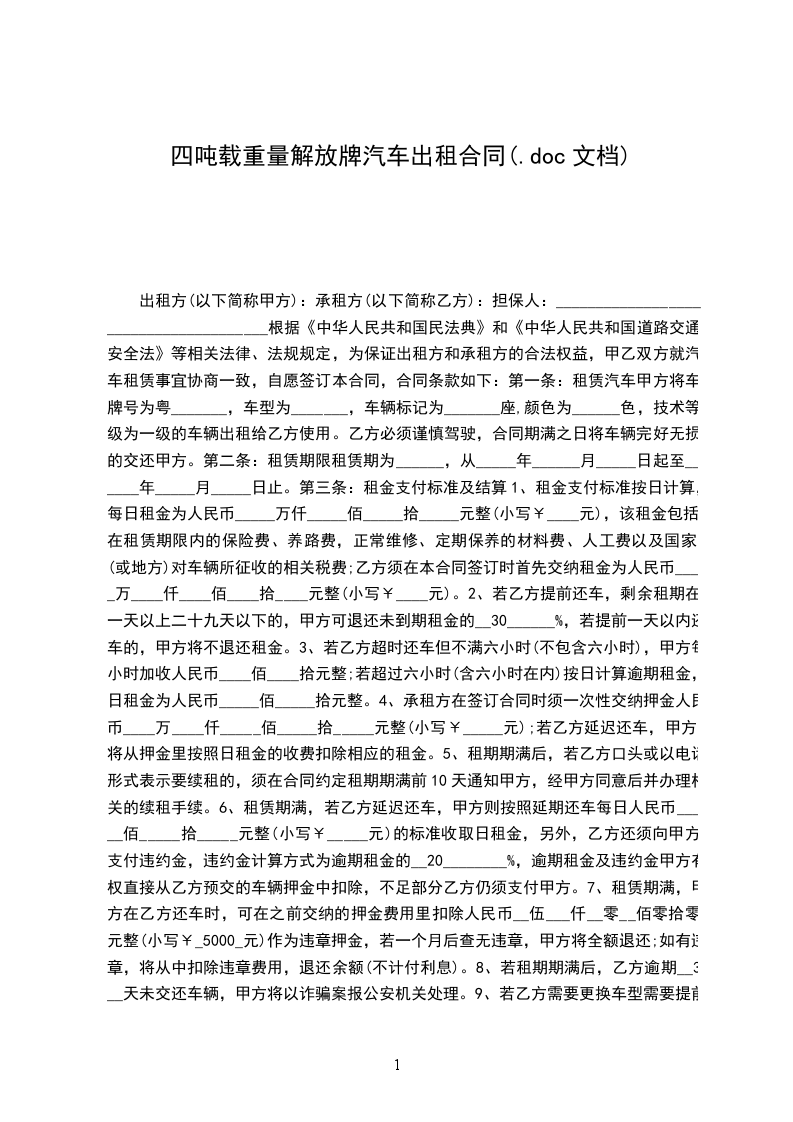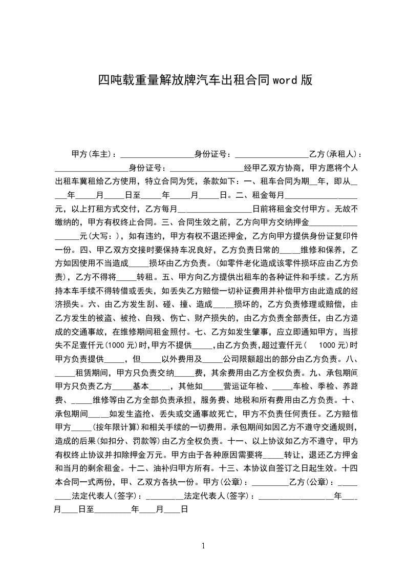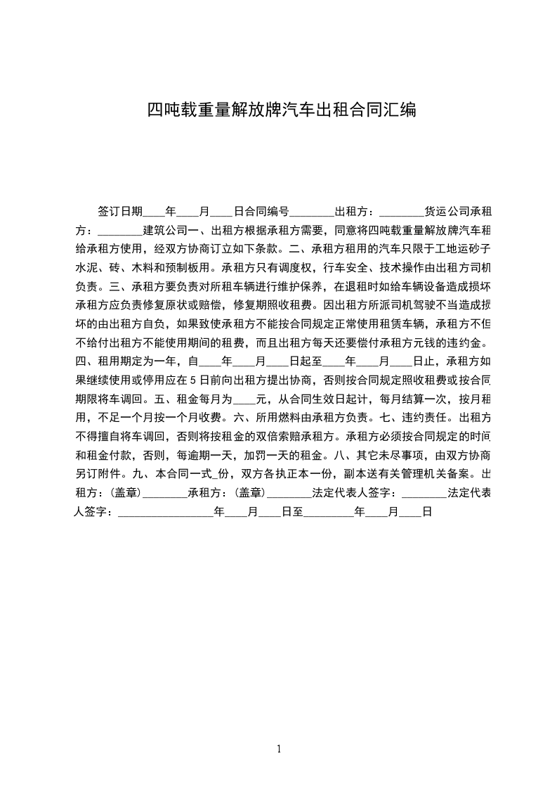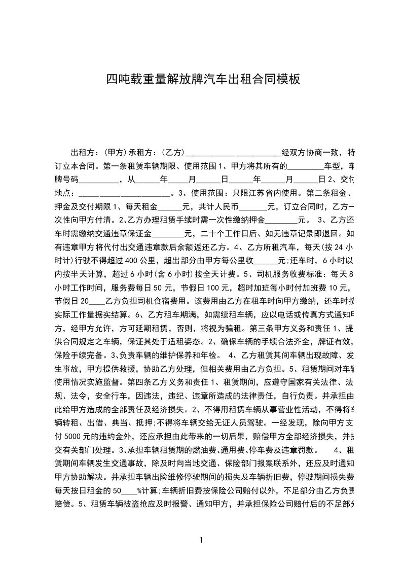 一、出租方根据承租方需要,同意将四吨载重量解放牌汽车租给承租方使用,经双方协商订立如下条款。