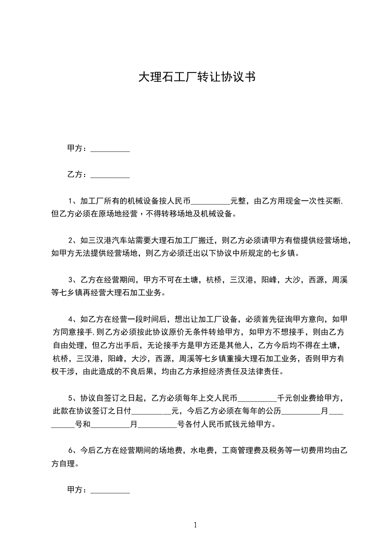 原由甲方投资兴建的三汊港大理石加工厂,经甲方与合伙人一段时期的艰苦创业,由于社会和事业因素,甲方决定退出她一手创办的大理石加工厂,由合伙人单独经营,具体转让办法经甲,乙双方在共存共荣的基础上达成以下协议: