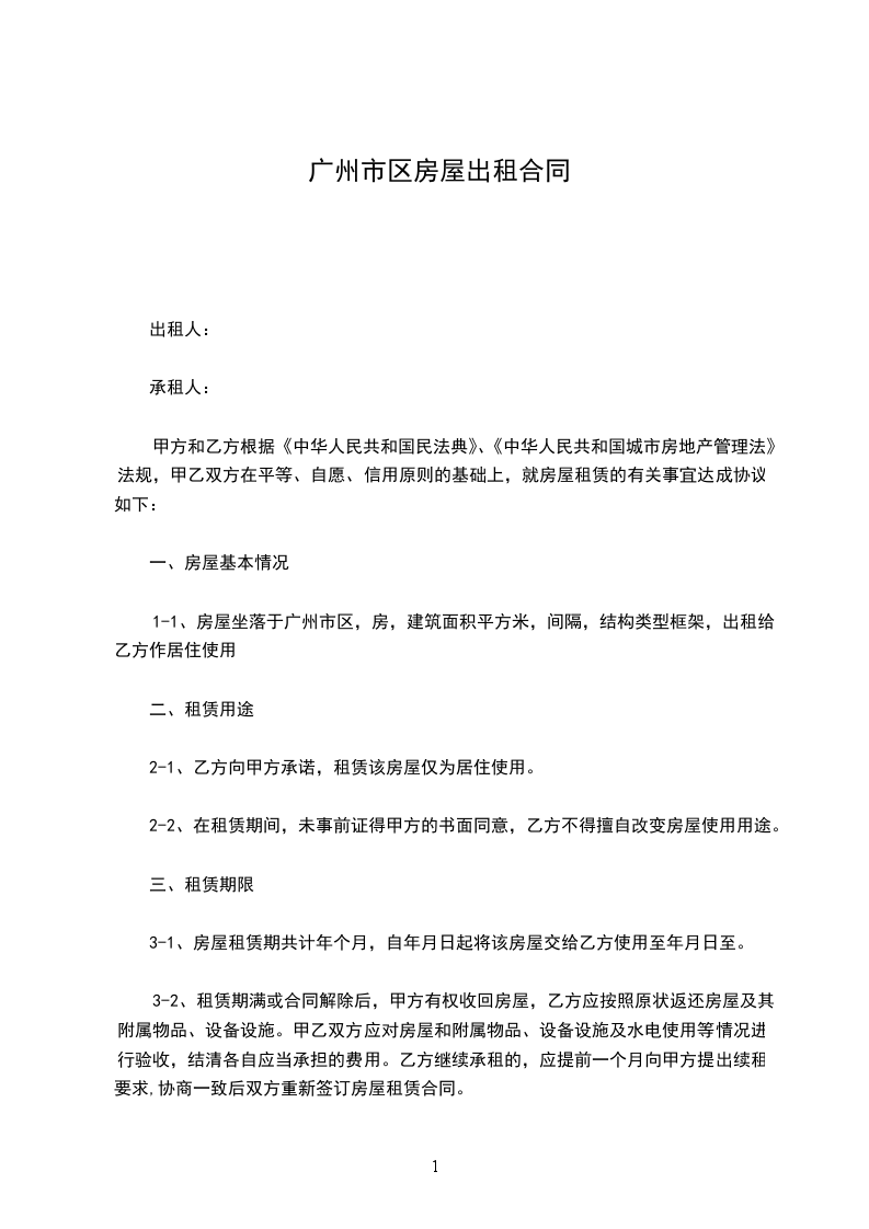 1-1、房屋坐落于广州市区,房,建筑面积平方米,间隔,结构类型框架,出租给乙方作居住使用