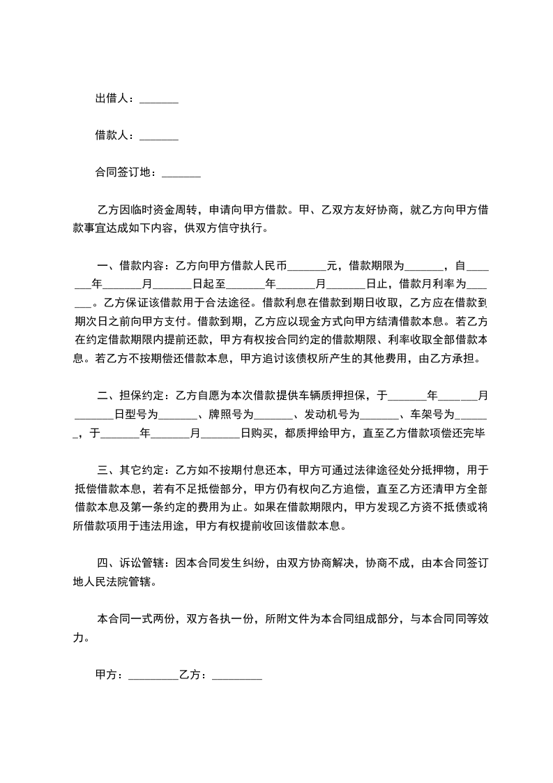 二、担保约定:乙方自愿为本次借款提供车辆质押担保,于_______年_______月_______日型号为_______、牌照号为_______、发动机号为_______、车架号为_______,于_______年_______月_______日购买,都质押给甲方,直至乙方借款项偿还完毕。