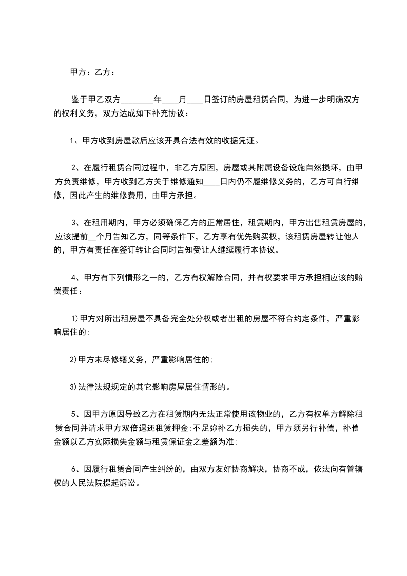 鉴于甲乙双方________年____月____日签订的房屋租赁合同,为进一步明确双方的权利义务,双方达成如下补充协议: