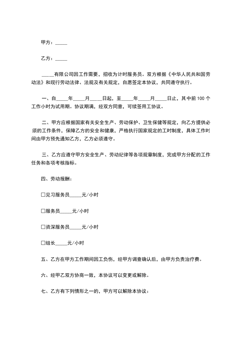 _____有限公司因工作需要,招收为计时服务员。双方根据《中华人民共和国劳动法》和现行劳动法律、法规及有关规定,自愿签定本协议,共同遵守执行。