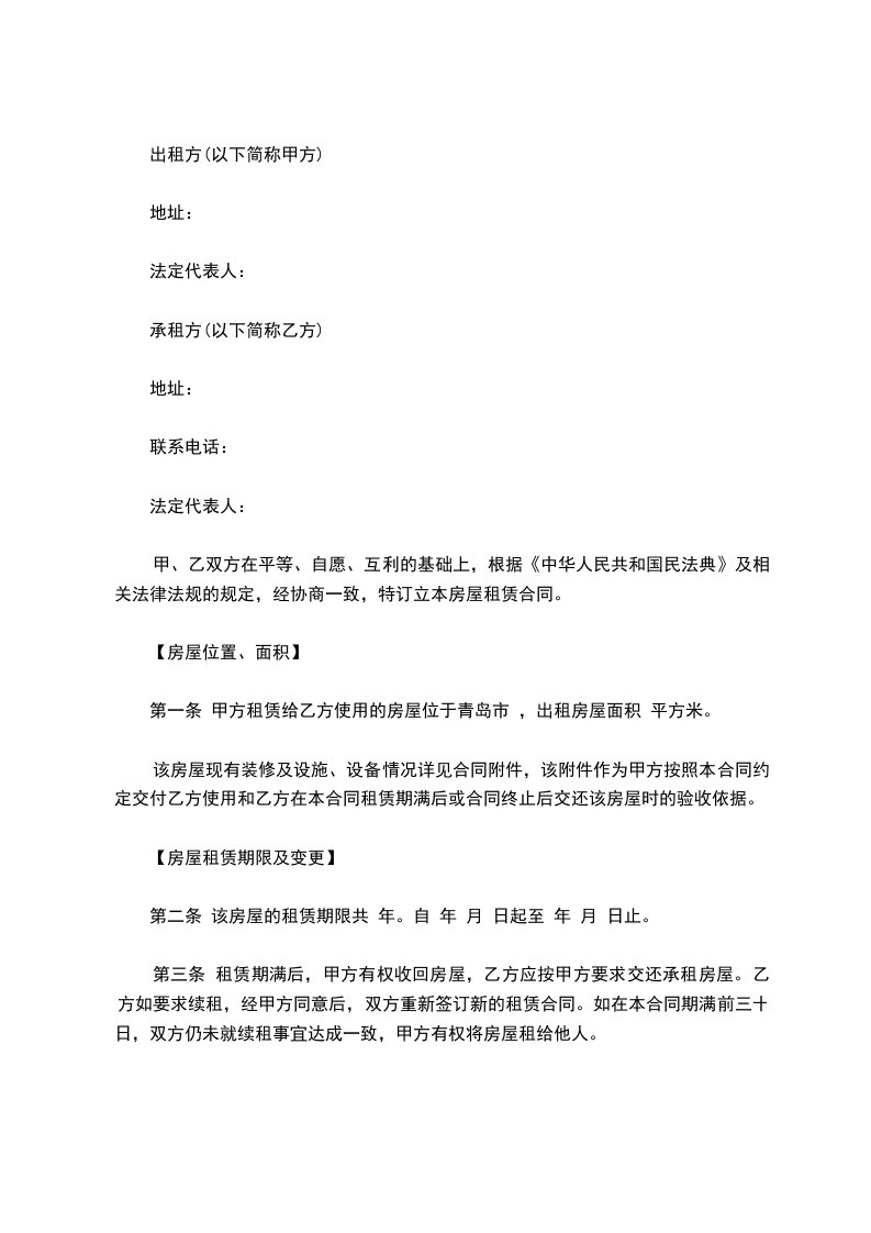 二、租赁期限:__________,即_____年___月___日至____年___月___日。三、租金及交纳时间:每月________元,乙方应每___月付一次,先付后住。第一次乙方应于甲方将房屋交付同时,将房租付给甲方;第二次及以后付租金,乙方应提前一个月付清。四、租房押金:乙方应于签约同时付给甲方押金_____元,到期结算,多余归还。五、租赁期间的其他约定事项: