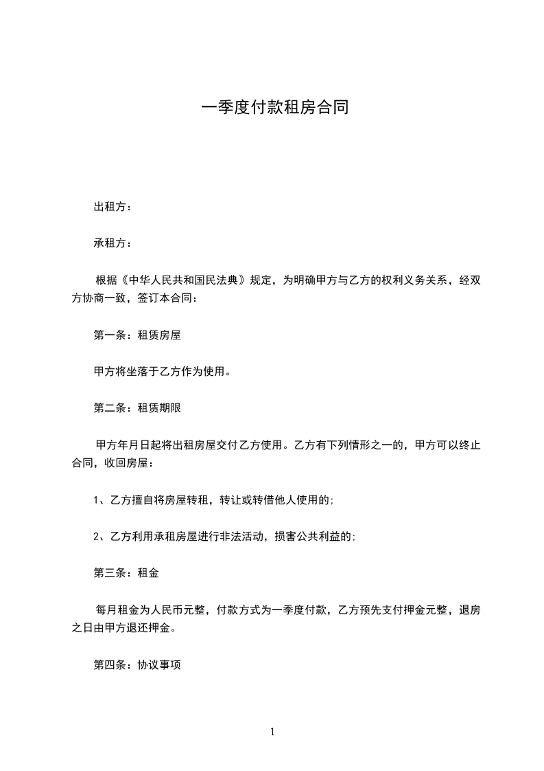 每月租金为人民币_____元整,付款方式为一季度付款,乙方预先支付押金元整,退房之日由甲方退还押金。