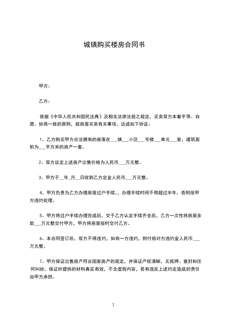 1、乙方购买甲方合法拥有的座落在___镇___小区___号楼___单元___室,建筑面积为___平方米的房产一套。