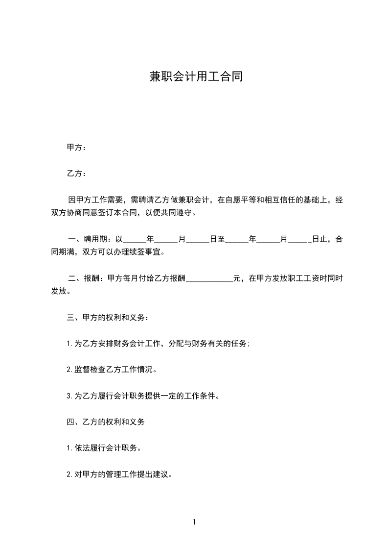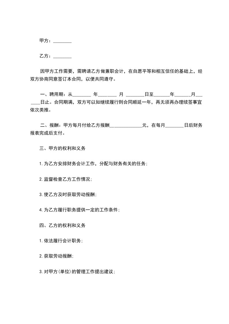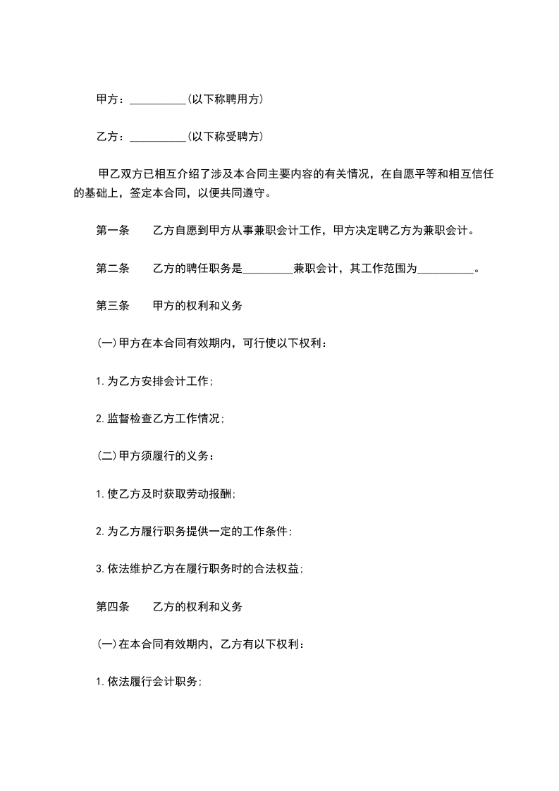 因甲方工作需要,需聘请乙方做兼职会计,在自愿平等和相互信任的基础上,经双方协商同意签订本合同,以便共同遵守。