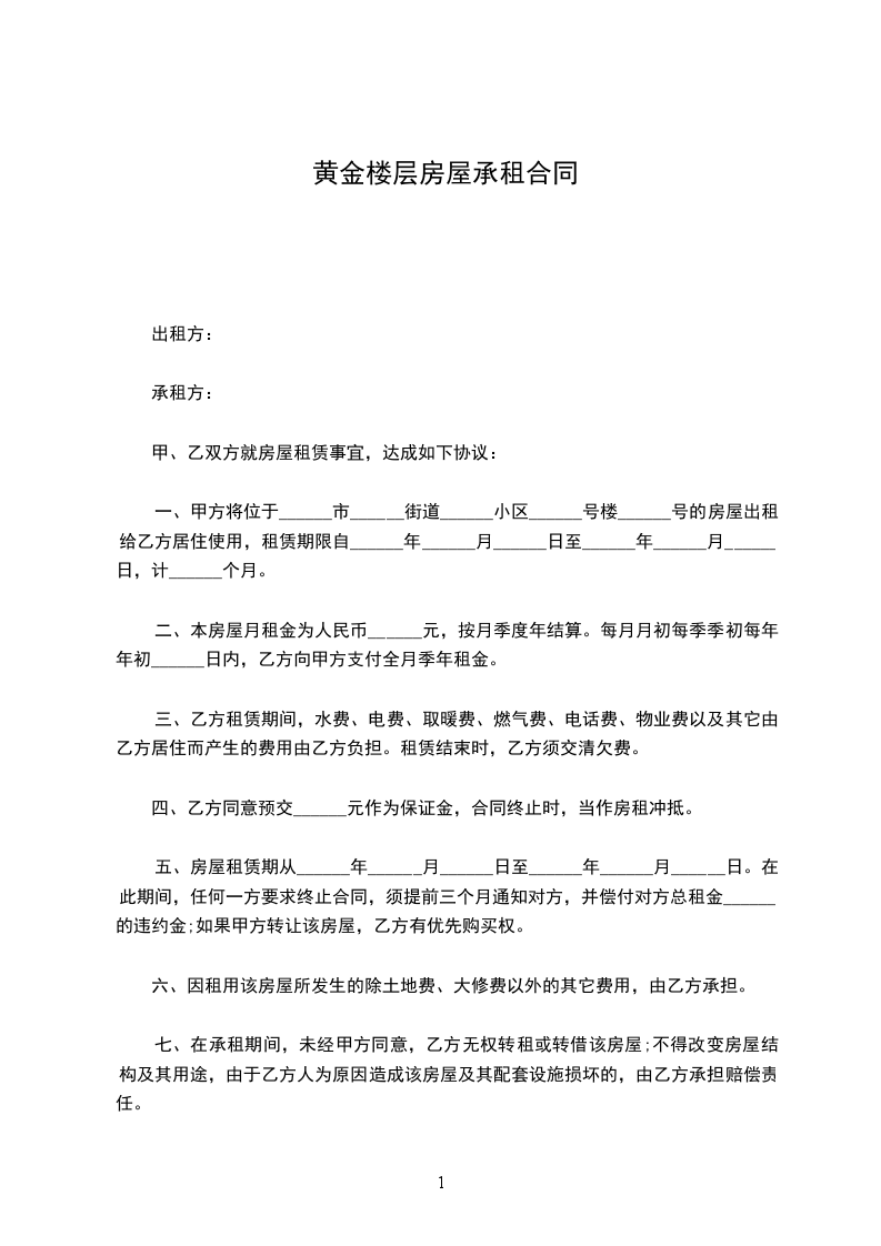 五、房屋租赁期从______年______月______日至______年______月______日。在此期间,任何一方要求终止合同,须提前三个月通知对方,并偿付对方总租金______%的违约金;如果甲方转让该房屋,乙方有优先购买权。