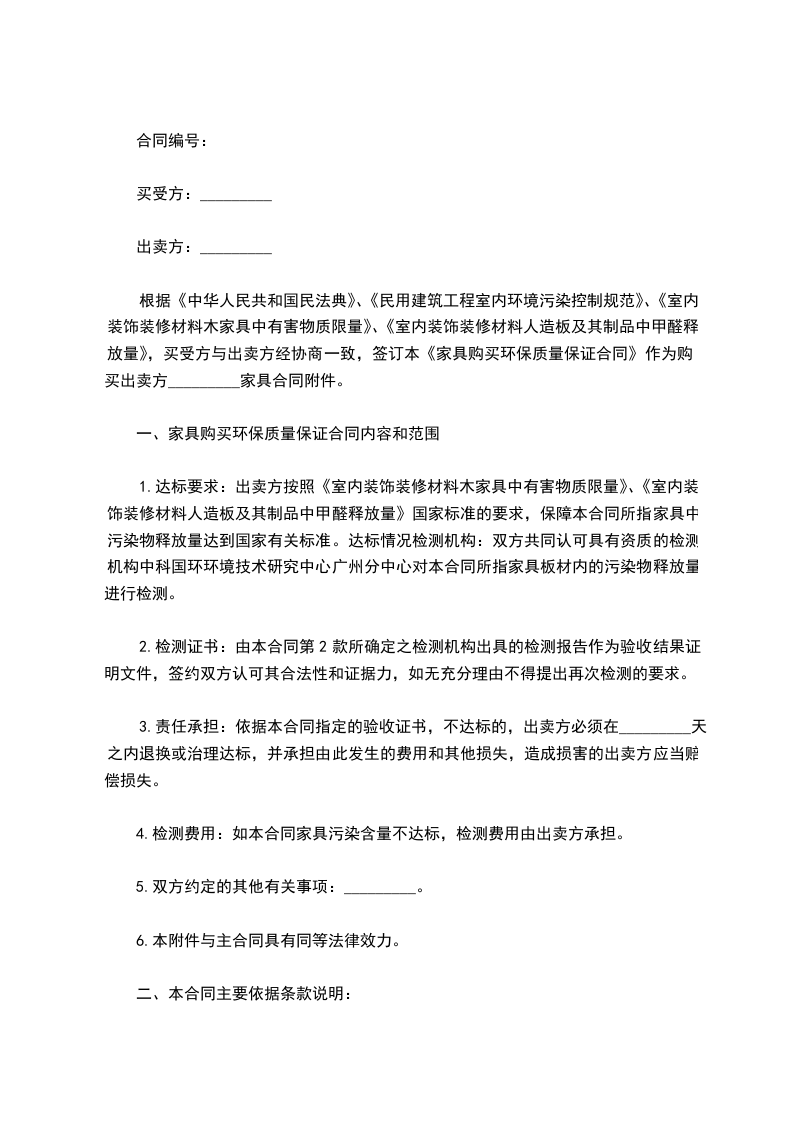 根据《中华人民共和国民法典》、《民用建筑工程室内环境污染控制规范》、《室内装饰装修材料木家具中有害物质限量》、《室内装饰装修材料人造板及其制品中甲醛释放量》,买受方与出卖方经协商一致,签订本《家具购买环保质量保证合同》作为购买出卖方_________家具合同附件。