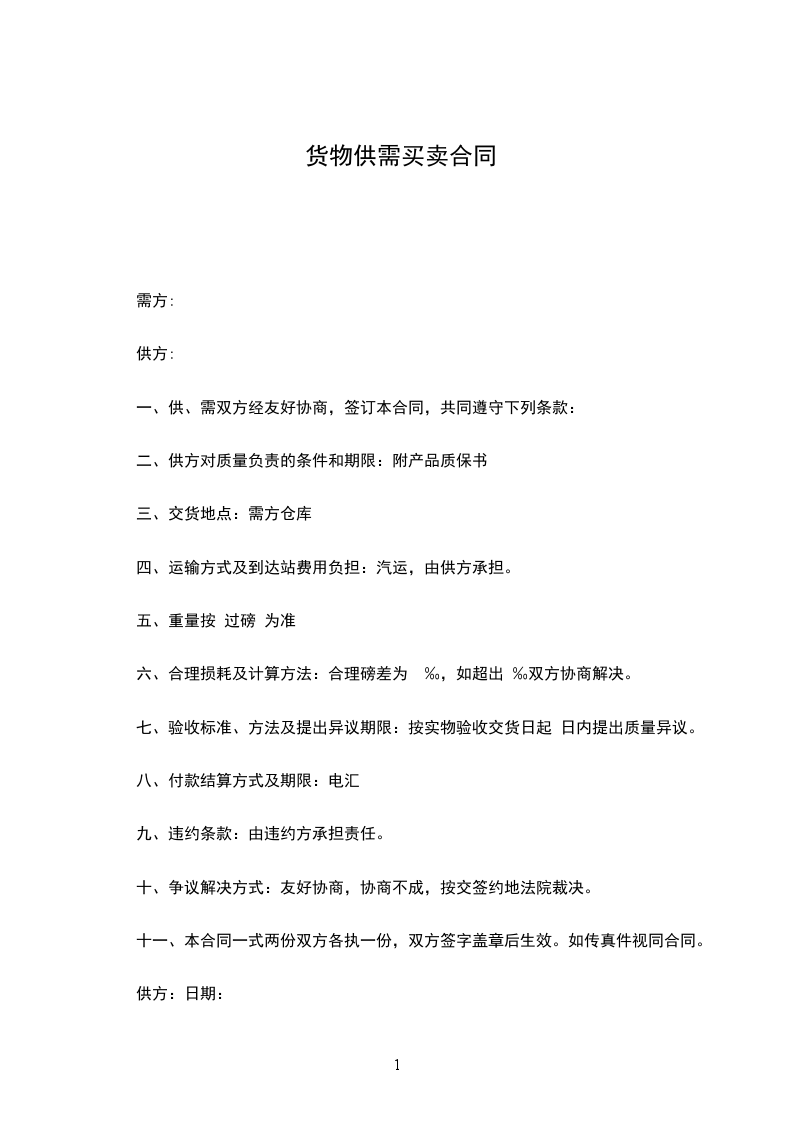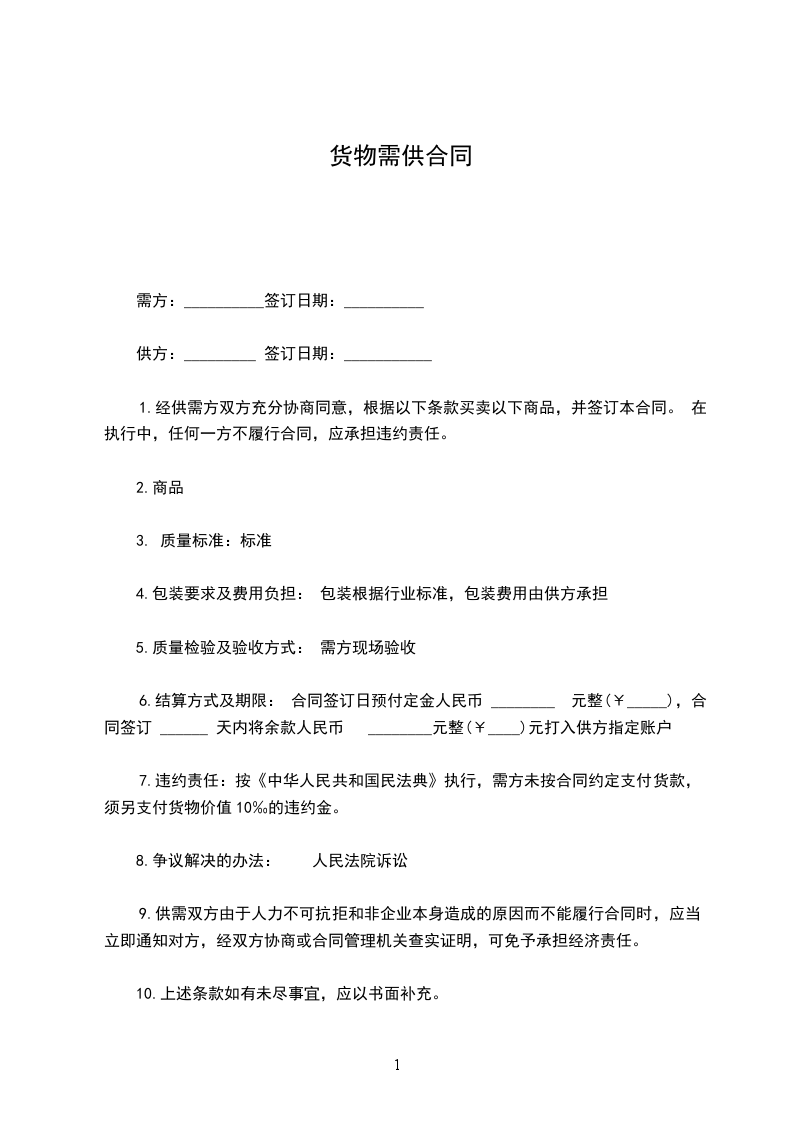 十、本合同一式两联,供方、需方各执一联,由供需双方签字盖章后生效。