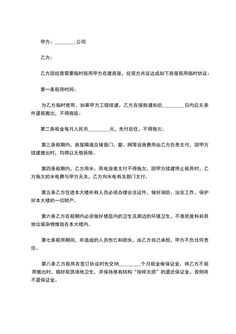 乙方因经营需要临时租用甲方在建房屋,经双方共议达成如下房屋租用临时协议:
