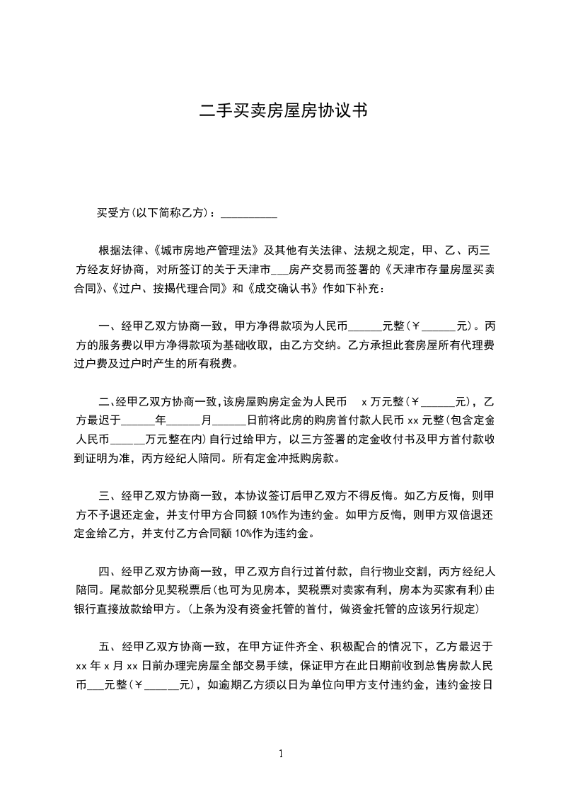 根据法律、《城市房地产管理法》及其他有关法律、法规之规定,甲、乙、丙三方经友好协商,对所签订的关于天津市___房产交易而签署的《天津市存量房屋买卖合同》、《过户、按揭代理合同》和《成交确认书》作如下补充: