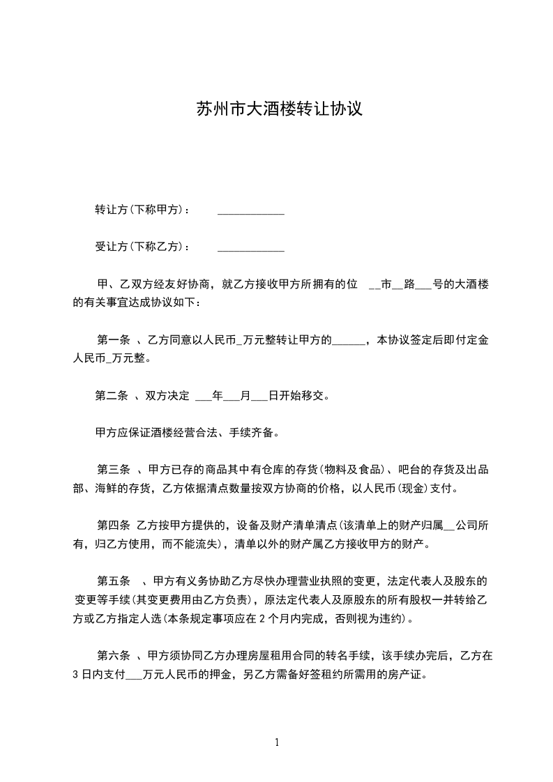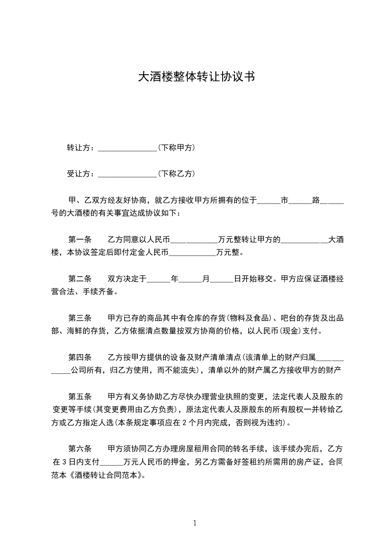 一、乙方同意以人民币_拾_万元整接收甲方的___大酒楼,本协议签订后即付定金人民币:__万元正。