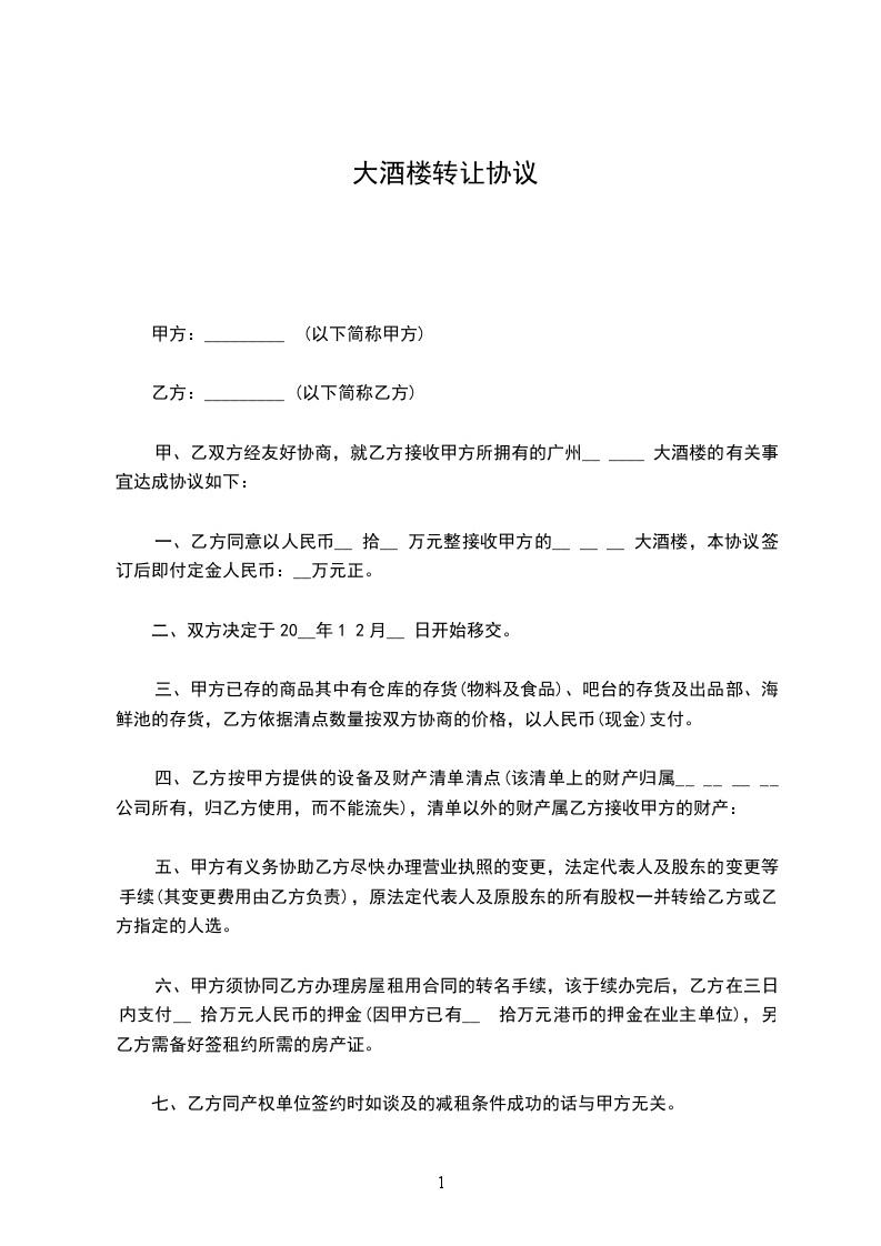 1。与______公司签订合约租金,由甲方负责协商解决,争取租金降至______元/月,至少在三年内控制在______元/月以下。否则,乙方不同意接收甲方的____大酒楼,甲方应在7日内退还乙方定金_万元正。
