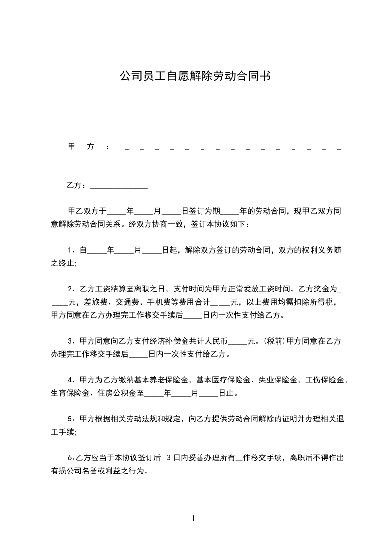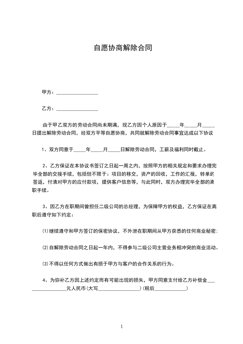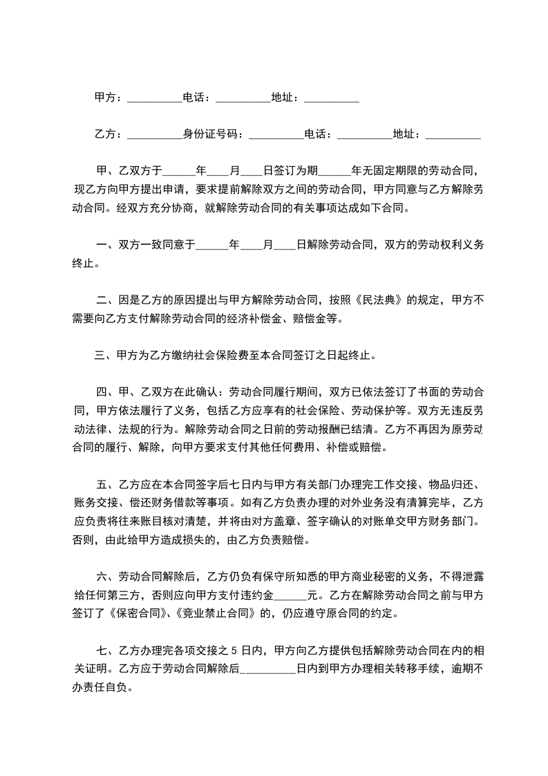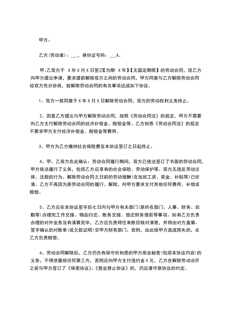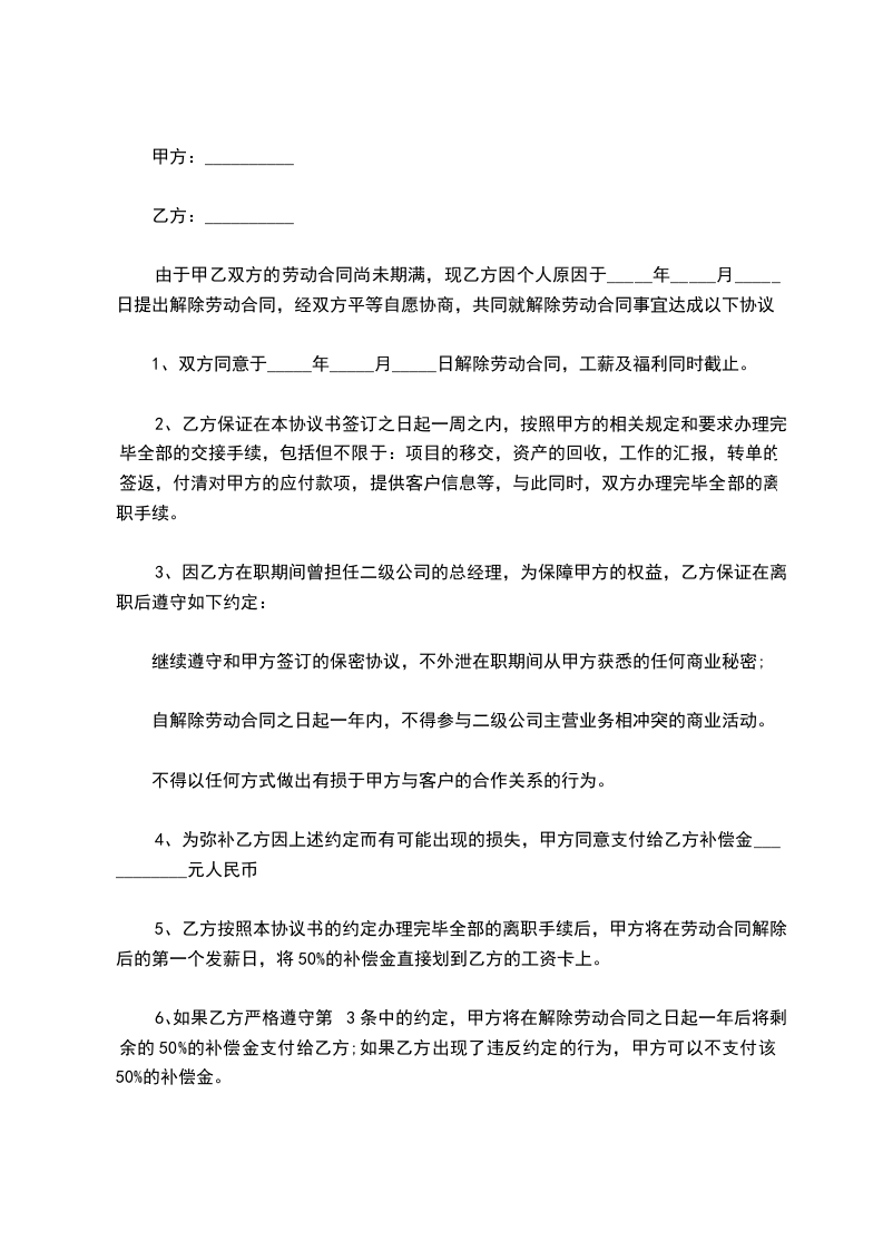 1、双方同意于_____年_____月_____日解除劳动合同,工薪及福利同时截止。