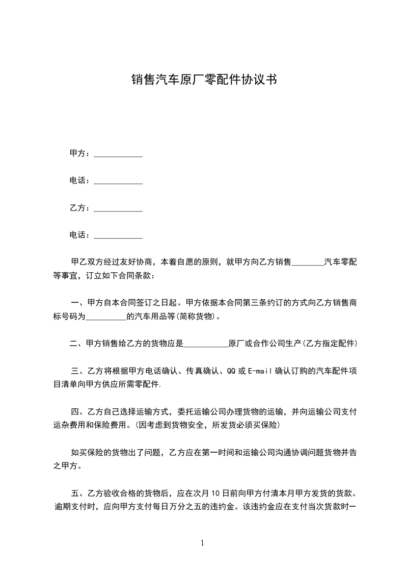 甲乙双方经过友好协商,本着自愿的原则,就甲方向乙方销售汽车零配等事宜,订立如下合同条款: