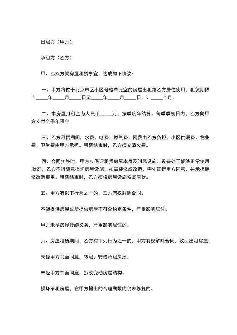 一、甲方将位于北京市区小区号楼单元室的房屋出租给乙方居住使用,租赁期限自_____年_____月_____日至_____年_____月_____日,计_____个月。