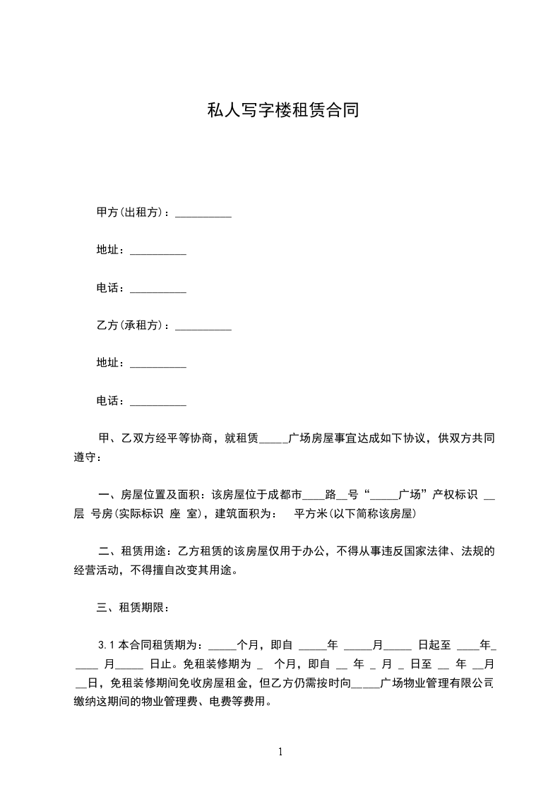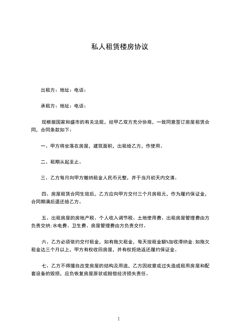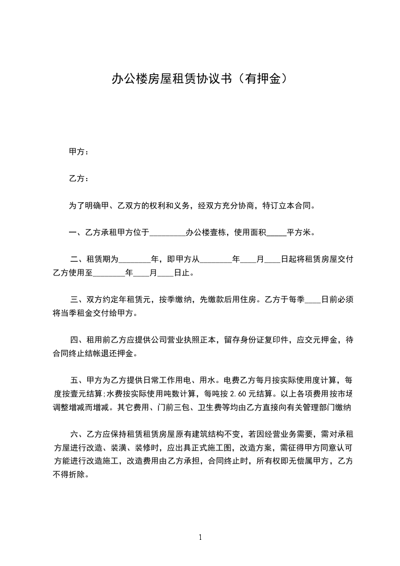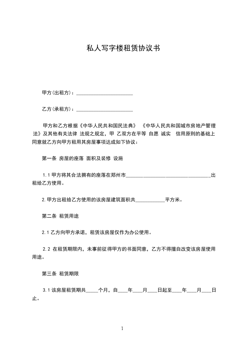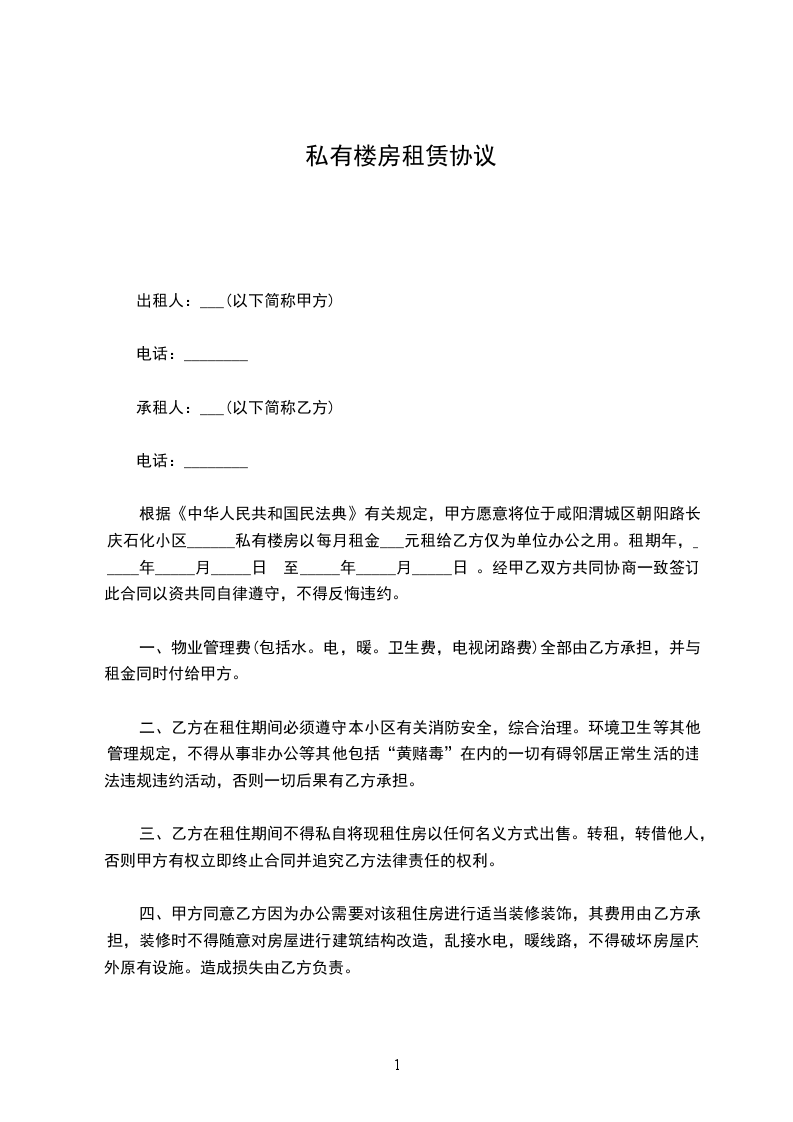 根据《民法典》有关规定,甲方愿意将位于 私有楼房以每月租金元租给乙方仅为单位办公之用。租期年,_____年_____月_____日至_____年_____月_____日。经甲乙双方共同协商一致签订此合同以资共同自律遵守,不得反悔违约。