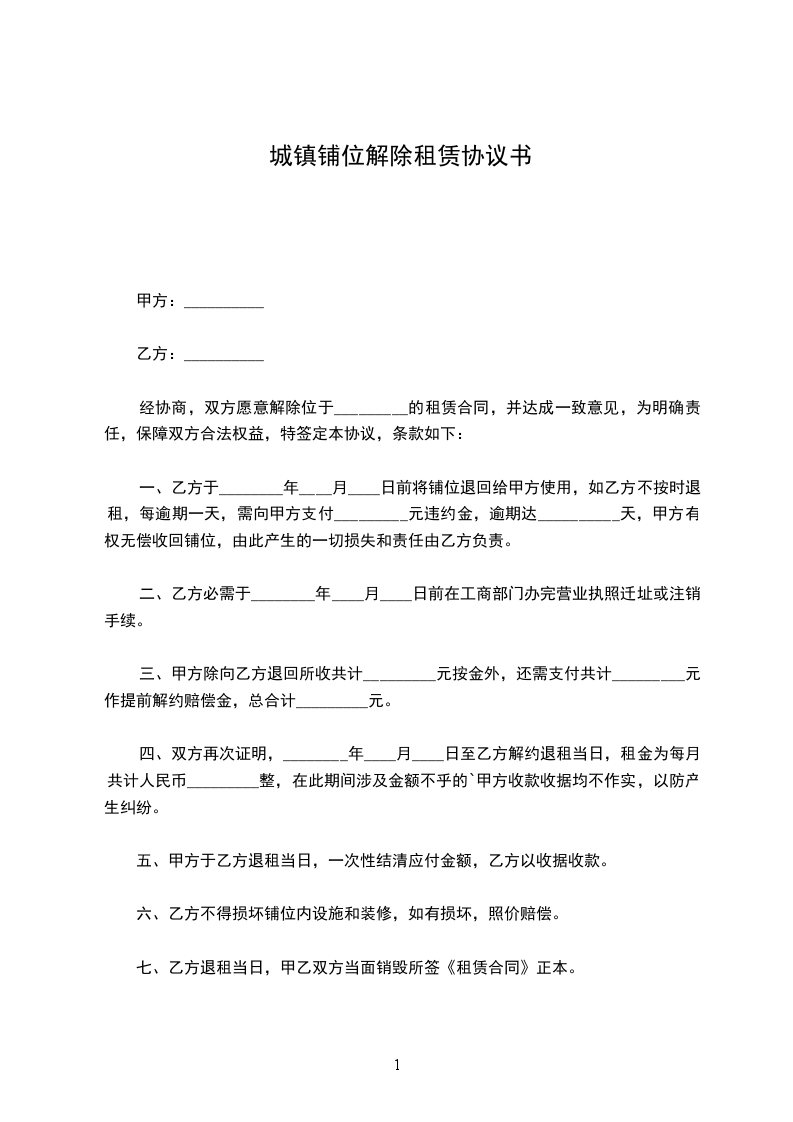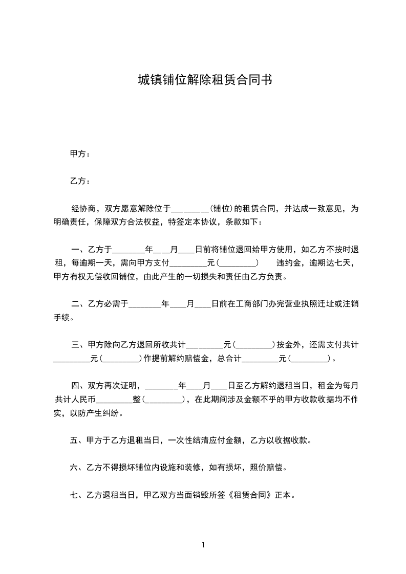一、乙方于________年____月____日前将铺位退回给甲方使用,如乙方不按时退租,每逾期一天,需向甲方支付_________元违约金,逾期达七天,甲方有权无偿收回铺位,由此产生的一切损失和责任由乙方负责。